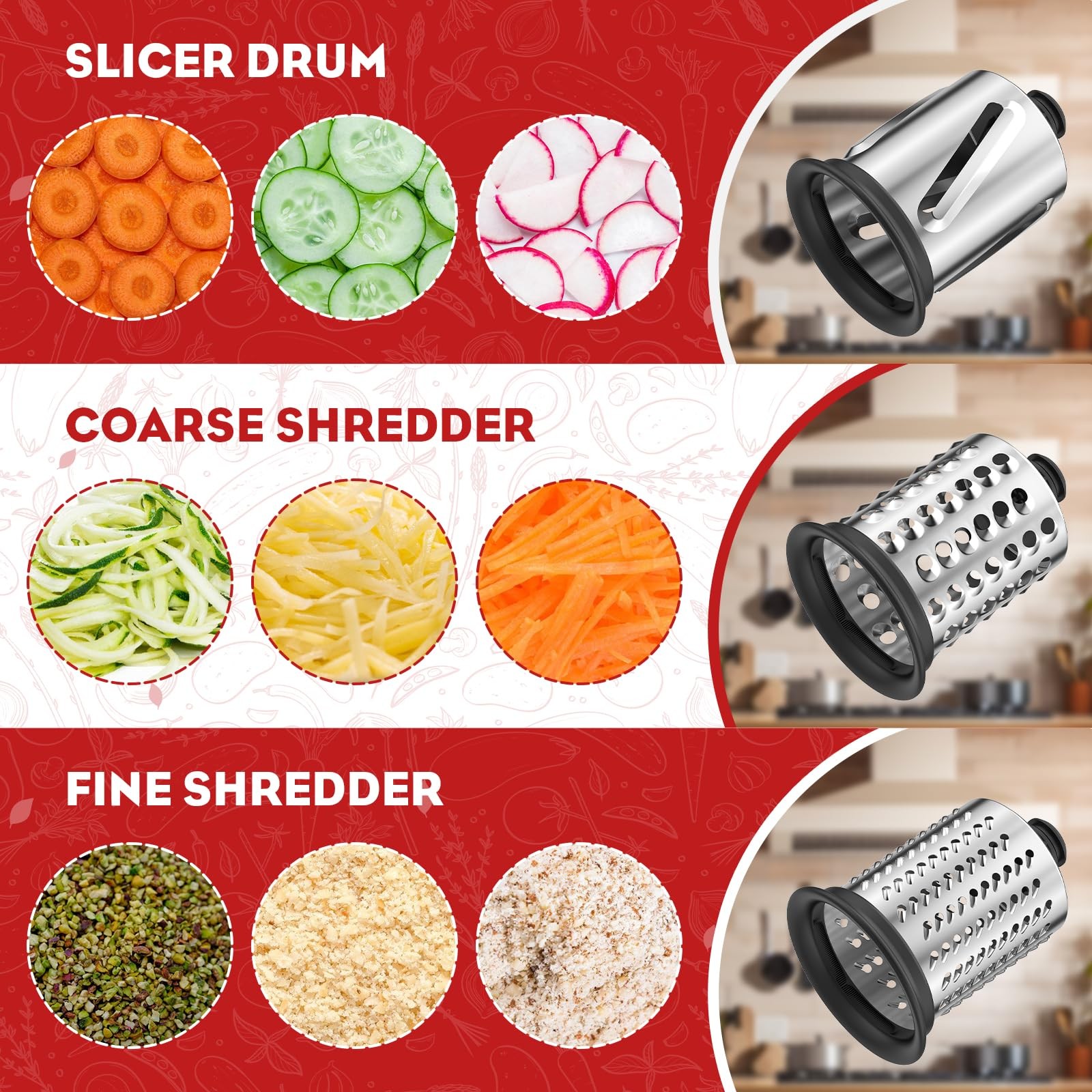 Meat Grinder & Slicer Shredder Attachments. For KitchenAid mixer accessories are tailored to perfectly fit both Kitchen Aid Stand Mixers and Cuisinart models SM-50, SM-50BC, SM-50R. 【Universal Compatibility Design】For Kitchenaid attachment are tailored to perfectly fit both Kitchen Aid Stand Mixers and Cuisinart models SM-50, SM-50BC, SM-50R. Designed specifically for KitchenAid, 's meat grinder attachment and slicer/shredder attachment for kitchenaid give you 2 fully functional mixer attachments in one order. 【Food-safe Materials】 meat grinder for kitchenaid mixer is made of high quality food safety grade aluminum alloy. kitchen aid cheese grater with BPA-FREE Materials, 360 degrees hole stainless steel blade, made of upgraded durable materials, which makes the blade stronger and not easily deformed. 【All-in-One Culinary Companion】This versatile stand mixer attachment kit includes a meat grinder, two grinding blades, four grinding plates, three sausage stuffer tubes, a cleaning brush, a removable food tray, and a food pusher. This kitchen aid mixer attachment for mixer can handle hard cheeses, raw meats, fruits, and more, providing flexibility for making a variety of sausages. 【Efficient Slicing and Shredding】The kitchen aid slicer shredder attachment for kitchenaid stand mixer boasts three durable stainless steel drum blades—5mm slicing, 6mm coarse shredding, and 3mm fine shredding—enabling you to process vegetables like cucumber, zucchini, cheese, carrots, mushrooms, nuts, and pizza toppings quickly, significantly reducing prep time. 【Easy to clean】Only the vegetable slicer attachment are dishwasher safe, it's suggested to clean other components manually using mild soap and warm water below 122°F. A dedicated cleaning brush is provided to clean any hard-to-reach areas. stands behind its products and offers support should there be any quality concerns.