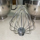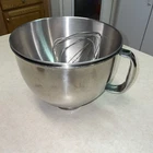 This item is in good used condition with scratches consistent with age and use. None of the items are marked KitchenAid, but all three fit my personal KSM150 stand mixer as well as my original attachments do. Both bowls are 8 3/4” in diameter. The handled bowl is 7 1/4” high; the small bowl (no handle) is 5 1/4” high. The wire whisk has 6 wires and is 6” high. See photos for details.
