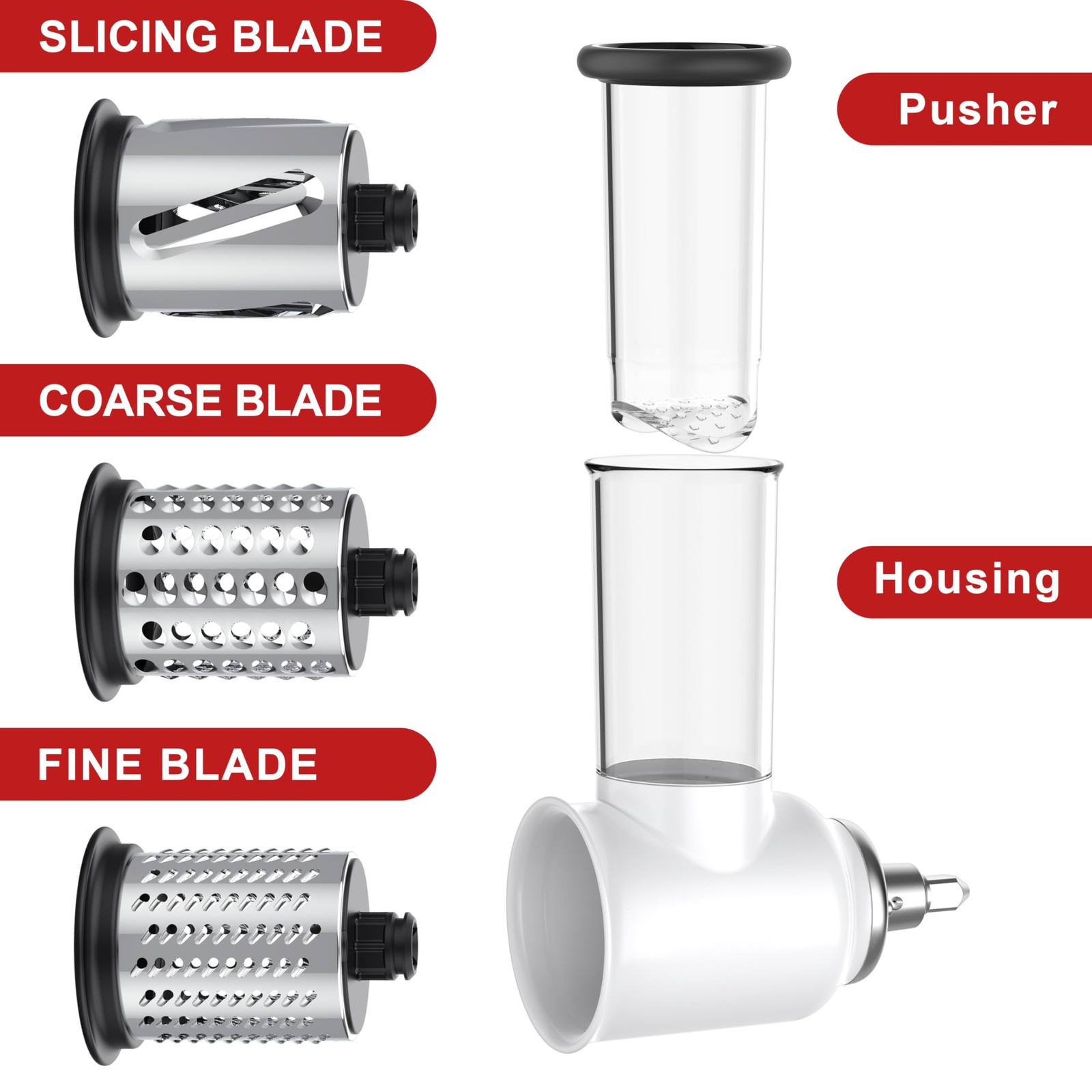 Slicer Shredder Attachment for KitchenAid Stand Mixers transforms your mixer into a versatile kitchen powerhouse, compatible with all KitchenAid and Cuisinart SM-50/SM-50BC/SM-50R models, featuring a snap-on design for instant setup and a BPA-free, food-grade plastic housing paired with three durable SUS 304 stainless steel blades (5mm slicer, 6mm coarse shredder, 3mm fine shredder) to effortlessly slice cucumbers, shred cheese, or finely grate nuts. Its 360° loop-cutting technology syncs with mixer speeds 6-8 for rapid, hands-safe processing, while included accessories like a food pusher and cleaning brush streamline prep and cleanup—blades are dishwasher-safe, backed by a 1-year warranty for worry-free culinary creativity. 's sophisticated design made this Slicer Shredder Attachment for KitchenAid Stand Mixer suitable all KitchenAid Mixers, even for the Cuisinart Stand Mixer SM-50, SM-50BC, and SM-50R. It is very convenient to connect this housing to the power hub of the mixer when using it. (Not belong to the KitchenAid) Be Slicer Shredder Attachment for KitchenAid Stand Mixer, housing is made of high quality food safety grade plastic, BPA free, for greater safety and excellence, white appearance shows clean. The 3 blades are made of SUS 304 stainless steel, which is more durable so that it is not easy to be deformed when used. This Slicer Shredder Attachment for KitchenAid Stand Mixer has a 360°loop cutting design, Matching stand mixer 6-8 speed. You can process food swiftly and save a lot of time on your hands. Built-in blades protect each customer's hands without cutting when you scrape the outside. Slicer Shredder Attachment for KitchenAid Stand Mixer includes 5mm Slicing Blade (for cucumbers, celery and zucchini), 6mm Coarse Shredding Blade (for cheese, firm vegetables like carrots), 3mm Fine Shredding Blade (for shredding nuts, pizza toppings and much more); 1 Cleaning Brush; 1 Food Pusher; 1 White Housing. This is a great gift option for people who own KitchenAid Stand Mixers. The blades are "top rack" Dishwasher Safe but the rest are NOT. Recommend Hand Wash Only to keep them in peak condition. 1-Year Warranty, Feel free to contact us if there is any quality issue.
