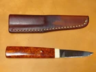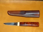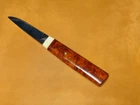 Product description This is a knife that I once received directly from Mr. Kiyoshi Kato, whom I had a chance to meet. There is only No. 1 blank paper and it cuts well. There is a KATO stamp on the base. Mr. Kiyoshi Kato says that in recent years, it has been difficult to obtain quince bulbs this red. He said. It's a masterpiece. ●Main specifications Blade length: 5.6cm Blade thickness: 3mm Handle length: 8cm Steel material: Shirogami No. 1 Handle material: Quince Accessories: Leather sheath ★Kiyoshi Kato Born in Tokyo in 1944 to a family of swordsmiths, he began training as a swordsmith at the age of 20. Although he was a swordsmith, he also showed an understanding of Western knives, and began making knives in 1977. The knives that Mr. Kato makes have the shape of Western knives, but they are made using the techniques of swordsmiths such as forge welding, forging, and folding, making them unique to Mr. Kato. The same inscription of Yoshiaki Fujiwara as his predecessor is engraved on cutlery and other cutlery such as knives. In 2000, he moved his workshop from Meguro, Tokyo to Hokuto City, Yamanashi Prefecture. ★Karinchu is a burr that is collected from a part of the root of the quince tree, a broad-leaved tree belonging to the leguminous family. It is popular as a material for high-end crafts. 【Features】 The wood grain is beautiful and creates intricate intersecting patterns. Particularly, the part with a mixture of dark and light parts is called ``Kohaku'' and is extremely valuable. ★The condition of the product is slightly scratched and dirty. For "remote delivery areas", additional fees will be chargeThese charges are normally collected by the delivering freight(shipping) company or when you pick the item up. -do not confuse them for additional shipping charges. We do not mark merchandise values below value or mark items as "gifts". -US and International government regulations prohibit such behavior.d. Import duties,taxes and charges are not included in the item price or shipping charges. These charges are the buyer's responsibility.