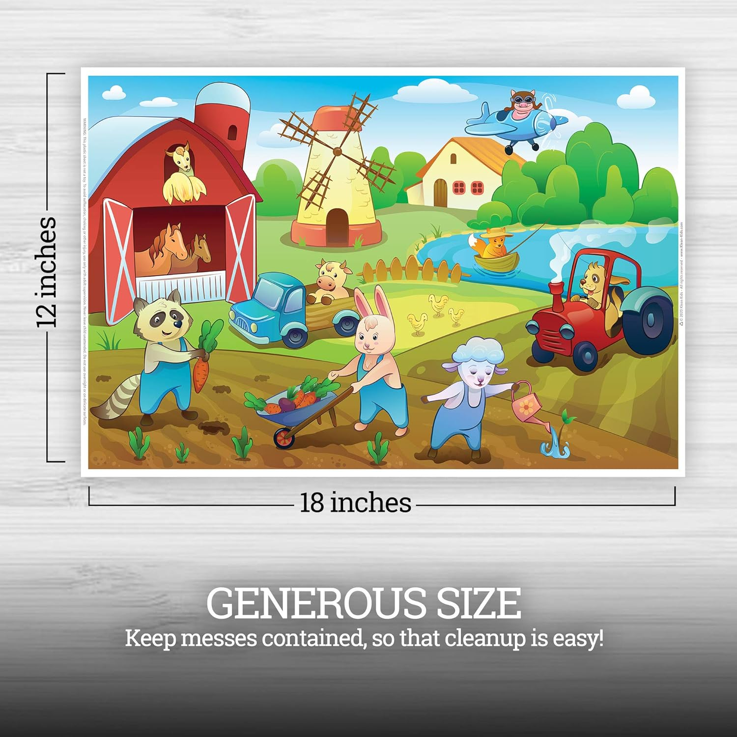 FUN IMAGES KIDS LOVE: This 40-pack set of placemats that stick features vibrant colors and delightful designs that will excite your child and keep them occupied as they explore new, imaginary worlds! STAYS IN PLACE: With a stick on placemat, your children's mat will no longer end up on the floor! Temporary adhesive strips on all 4 sides make it difficult for toddlers to pull them free, and yet they're easy enough for adults to remove when done FULL COVERAGE: The large 12"x18" size means your infant can eat off the mat itself (skip the plate), without concerns about the table cleanliness! Your child will learn independence and self-feeding skills, and you'll enjoy easy clean up later EASY TO GRAB-AND-GO: Unlike some competitors, our placemats are individually folded, which makes them much more convenient to grab and go! Simply grab one from the top of the stack, and you're ready for grandma's house or a restaurant SAFE FOR KIDS: Our sticky placemats for toddlers are tested and verified by third-party labs to ensure that the plastic meets or exceeds all safety requirements (BPA, PVC, and Lead-free). We don't cut corners on children's health and safety Product Description Disposable Placemats for Eating, Crafting and Travel! HomeWorthy is dedicated to providing high quality products that are safety-tested and approved for use by everyone, from infants to adults! We offer a large assortment of disposable placemats that help protect you and your loved ones from lingering yuckiness on public surfaces. With disposable placemats that stick to the surface, you will rest assured that you have a clean surface on-the-go. Protection for Restaurants They provide a clean surface for kids to eat off, and they also protect tables from spills and messes. You'll enjoy easy cleanup afterwards, and your servers will appreciate you! Ditch the plate...just let them eat right on the mat! Multi-Purpose Placemats Your kids will love our 40 pack placemats of various Animal designs! They're easy to slip into your purse for travel, or leave in your glove box for when you're on the go. They also make great airplane tray covers (they fit all tray sizes---simply pull off the sticky strips and fold them over the edges of your tray), traditional meal placemats, and can be used in any social situation when you need a guaranteed clean surface for your child. SAFE EATING SURFACE Whether your child has food allergies, or you just want to protect them from dirty surfaces and more---we have it covered (literally). EASY CLEANUP WHEN CRAFTING Enjoy easy clean up for meals or messy children's crafts. No longer worry about markers, paints or play dough on your delicate tables! STICKY ADHESIVE STRIPS We know those little ones love to pull their placemats to the floor. With 4 adhesive sticky strips on the backside, these mats will stay in place where you put them!