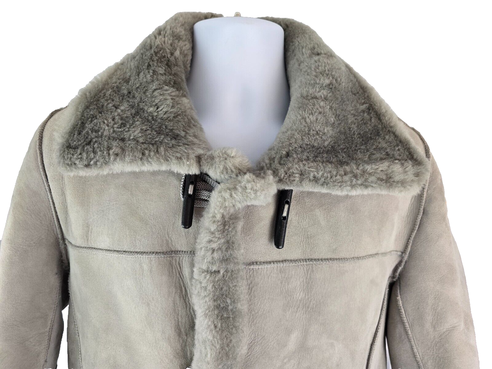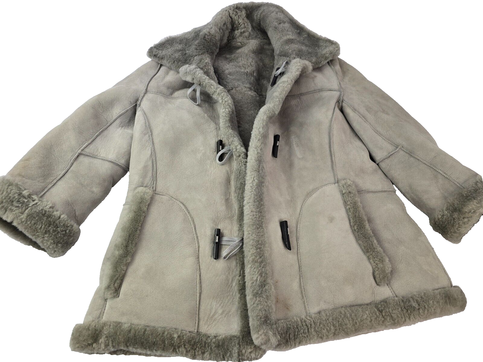 Available for sale is a very beautiful Women's Knight Tailors Reversible Suede Sheepskin New Zealand Coat in size 38 (fits like a Women's M to L or Men's S, check below measurements). This beautiful genuine Heavy & Thick Knight Tailors NZ Sheepskin Suede Reversible Coat is in a beautiful gray color with a super soft and thick gray fur sheepskin lining on the interior. The coat can be worn reversible with the fur on the exterior with both sides featuring two outer pockets and wood toggle buttons. The New Zealand sheepskin fur on the inside is super warm and exceptionally soft. Knight Tailors is one of the premier sheepskin brands and you won't find a coat made of higher quality suede and sheepskin. This vintage coat was made in the 1970s or 80s and includes the original rubber eraser and an additional toggle button. The gray suede exterior is supple and soft and is in like new. Other than a small stain on the bottom right, the coat has almost no signs of wear and no stains, tears, cracks, holes, or major flaws. Please check the measurements below. Details: A smooth charmer, the Bennett sheepskin coat is tailored to exude handsome confidence. From the rich Merino sheepskin that insulates against the cold to the intricate pick stitching details on the front placket, the Bennet is big on charisma, whether you’re wearing it to the office or about to make an impression on someone special. Italian Merino sheepskin Fine tailoring includes pick stitching on front placket Natural corozo button closures 4 pockets: 2 outer slip, 2 inner zip Specs : 33" long, 3.65 pounds Made in: Turkey A warm and inviting curly Merino sheepskin coat Artisan crafted for years of wear 33" long, 3.65 pounds Measurements: Shoulder: 20" Chest: 24" Length: 34" Sleeve: 25" Payment: We Accept eBay Payments which accepts most debit & credit cards and linked bank accounts. PayPal is also accepted. Shipping: We ship within 24-48 hours and we generally use USPS Ground Advantage or USPS Priority Mail for most of our shipments. We ship to al 50 states and we also ship Internationally as well, using eBay's International shipping service. We also offer expedited International shipping for an additional cost as well.