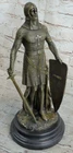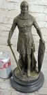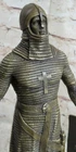 Knights Templar Crusader Warrior Knight Bronze Statue Sculpture Figure Artwork Knights Templar Crusader Warrior Knight Bronze Statue Sculpture Figure Artwork Condition : This sculpture is in perfect condition. Bronze Dimensions with Marble Base: Height 15" X Width 6.5" Marble Dimensions: Diameter 6.5" Height without base:14" Weight:11 LBS Inventory:91STE33476319 Introducing the striking bronze sculpture of a bold knight, poised to seize his adversary's castle with unwavering determination. Prepared for battle, he brandishes his mighty sword, ready to launch a formidable attack. Every aspect of his full armor has been meticulously crafted with exceptional detail and accuracy, showcasing the artistry of the sculptor. Adorned with a coif, a neck guard beneath his helmet, and an iron meshed gauntlet beneath his breastplate, the knight ensures maximum protection. His knees are safeguarded by knee cops embellished with two valiant lion heads, adding a touch of regal symbolism to the sculpture. This handmade bronze masterpiece has been shaped using the ancient lost-wax casting method, an age-old technique renowned for capturing intricate details and preserving the essence of the artwork. A brown patina finish enhances the sculpture's visual appeal while ensuring its long-term preservation. The sculpture stands proudly upon a black marble base, symbolizing strength and sophistication. Imprinted with the European Bronze Finery stamp of quality, it assures the authenticity and high standard of craftsmanship. The base also bears the signature of the talented artist, J.R Colinet, further solidifying its value and uniqueness. Embrace the spirit of chivalry and honor with this awe-inspiring knight sculpture, a testament to the timeless appeal of medieval legends. Make a bold statement in your home or office with this remarkable piece of art, capturing the essence of bravery and valor. Signed Lange Bold Knight Warrior With Sword Bronze Statue Sculpture Figurine Art www.bronzhaus.com Video will open in a new window Using the eBay App? Paste link into a browser window: [isdntekvideo] Shipping Terms : Most of our items are shipped via USPS (United States Postal Service) mail or UPS. Most orders are shipped within 24-48 hours of purchase. Please be aware that not all items are available for USPS shipping due to size and weight. We do ship to Hawaii, Alaska, Canada, Puerto Rico, APO/AE, and U.S. Virgin Islands, however, an additional charge may be required. Please contact us before making any purchases in these areas. For Non-USA customers, you may be responsible for all duty, tax, brokerage fees that may be due upon delivery (shipping costs cover freight charges only). We also ship internationally. Please refer to the "Shipping and Handling" chart for the rates for each area. Payment : We accept just about any form of payment. PayPal, Master Card, Visa or American Express credit cards. Money orders, cashiers checks, and even personal or business checks. For governmental institutions, we will also accept a purchase order. Please understand that for personal or business checks we have to wait for the check to clear (usually 7 days) before shipping. Condition : New Detailed Hand Crafted Hot Cast Bronze ~Not Resin~ Satisfaction Guaranteed. This is Stock Photo, Slight Color Variation!! Listing and template services provided by inkFrog
