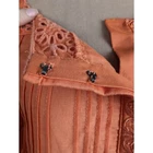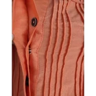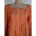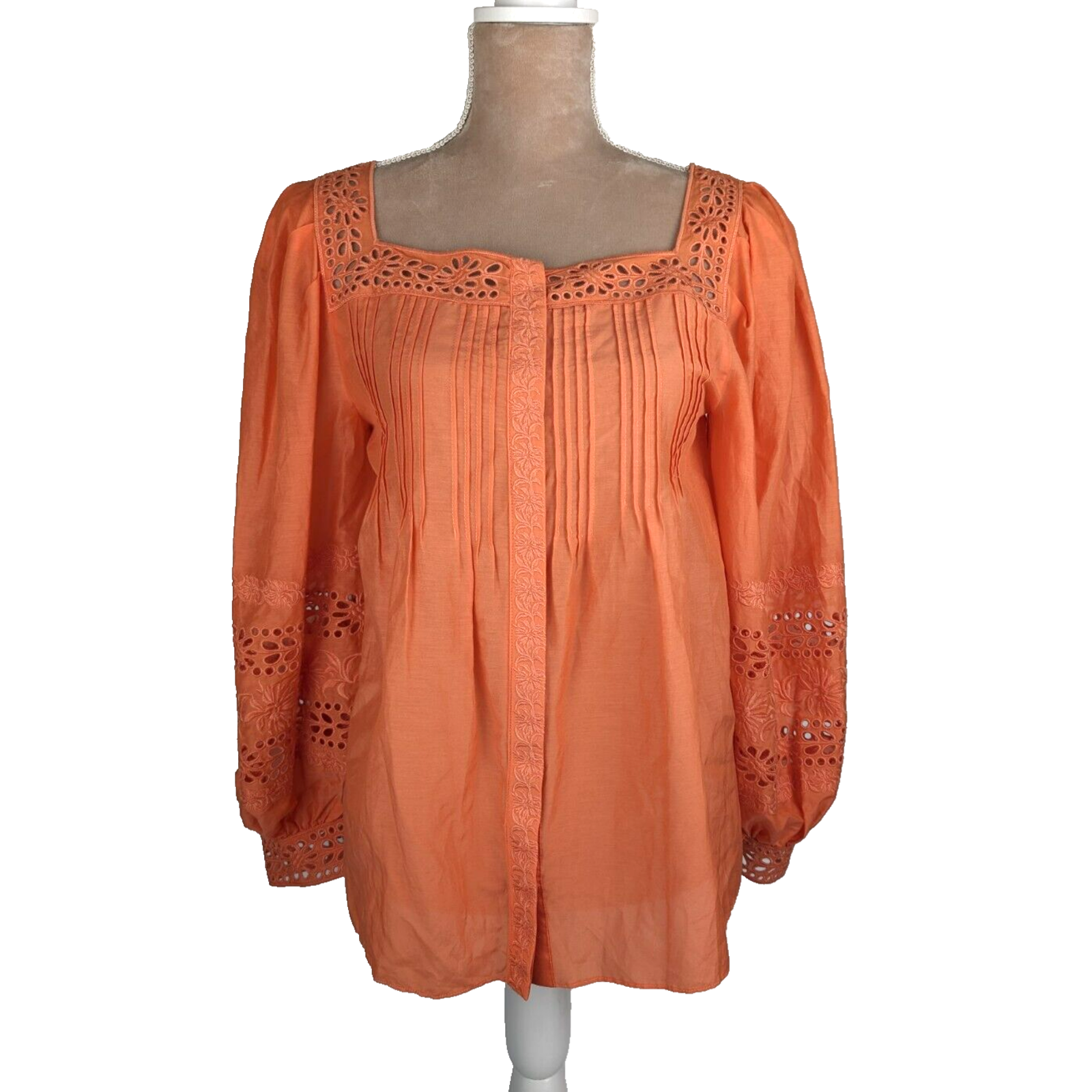 Love this blouse! The coral-orange shade is so vibrant and flattering, and the silk blend gives it a luxurious feel. The small eyelet detailing adds a touch of elegance, and the fit is perfect—just enough structure without being stiff. The button-down design stays secure thanks to the hidden snaps, so no gaping. Even with the minor flaw mentioned (tag removed), it's still a fantastic find. Looks way more expensive than it is—definitely a wardrobe standout! Would buy again.