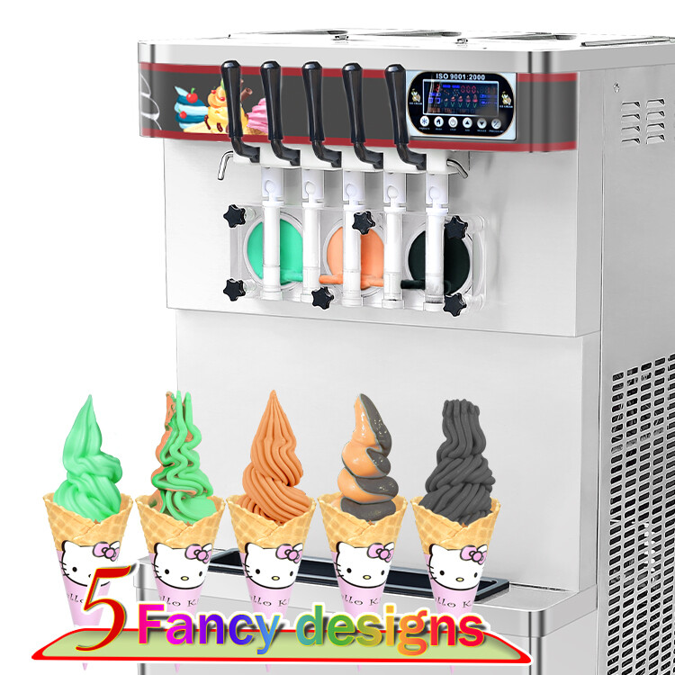 Kolice Commercial heavy duty floor stand 5 flavors soft ice cream machine,3+2 mixed flavors, ETL certificate, 110V 60HZ, 2000W , US plug, 4.3” touch control panel, non slip foot design, new design model,full transparent dispensers, you can make clear of the ice cream making status, greater expansion rate to makes the ice cream more smoother and softer Production capacity:11 gallons / hour,3x7L hopper, 3x1.5L cylinder, auto counting ,auto washing,fast cooling,easy to operate,low energy consumption, upper tanks refrigerated, mixtures can keep fresh standby in upper tanks overnight. Heavy duty commercial compressor, already charged in full refrigerant gas before packing, 5 mold tools(discharge nozzles) included, it can produce 5 different fancy shapes of ice cream cone Food grade stainless steel, dimensions :62x60x123cm(24.41''x23.62''x48.43''), Packing Size :81x72x149cm (31.89”x28.35”x58.66”), 1 unit/1 plywood case. N.W.:130kg(286 lbs), G.W.:165kg(363 lbs), additional silicone seal rings, small brush for cleaning and user manual in English comes with machine Available to use in ice cream shops, dessert shops, bars, cafes, milk-tea stores, restaurants, hotels, bakeries, cafeteria and so on