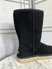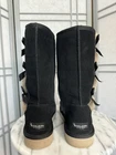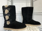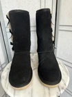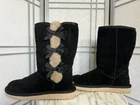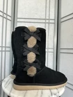 The KoolaBurra By Ugg Victoria Winter Boots are designed for women in size 9 with a round toe shape and low heel height. These black suede boots feature a decorative bow accent, faux fur lining, and a cushioned insole for comfort. The mid-calf shaft style and 1-inch platform height make them suitable for winter wear, with a rubber outsole for traction in snowy conditions. This stylish yet functional boot from the UGG Australia Kolaburra line is perfect for travel, casual outings, or outdoor activities in cold weather. Pre-owned in overall great condition pictured. Some flaws to point out: Some minor piling of suede on back of right boot and a little on left (as pictured). Interior has been steam cleaned, back of heel is a little worn (loss of cushion).