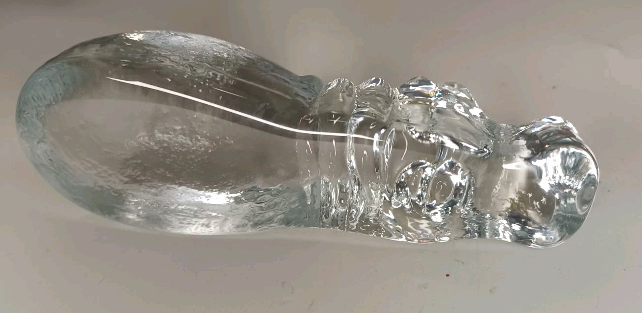 The Kosta Boda Swedish Art Glass Hippopotamus 5" Paperweight is a stunning sculpture made of clear glass, showcasing a unique and detailed design of an animal. This vintage original piece from Scandinavia features a Scandinavian style and is a true representation of art glass production. The absence of a backstamp adds to the mystery and allure of this exquisite paperweight, making it a perfect decorative addition to any collection or space.