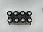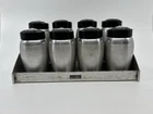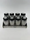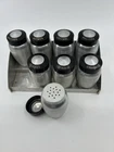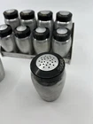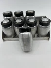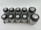 Vintage Kromex Spice Rack with Super rare sugar and flour shaker. Each spice container has a removable aluminum shaker plate. The AllSpice lid has a chip in it. The sugar shaker lid has a crack. See pictures. All still functioning as intended.