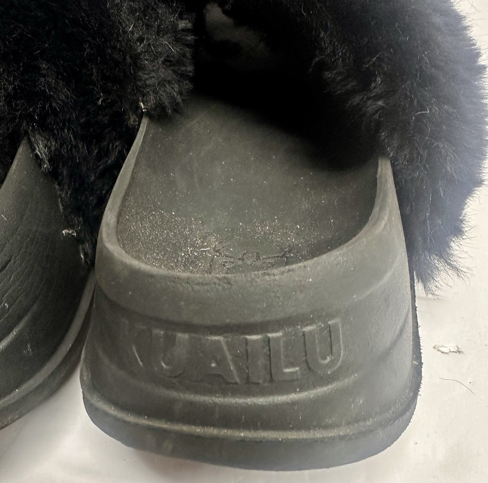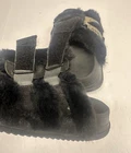 KuaiLu women's fuzzy slides with arch support. They feature faux fur cross-band straps, one of which is adjustable, and a platform sole with significant cushioning intended to provide comfort and relief for foot issues like plantar fasciitis.