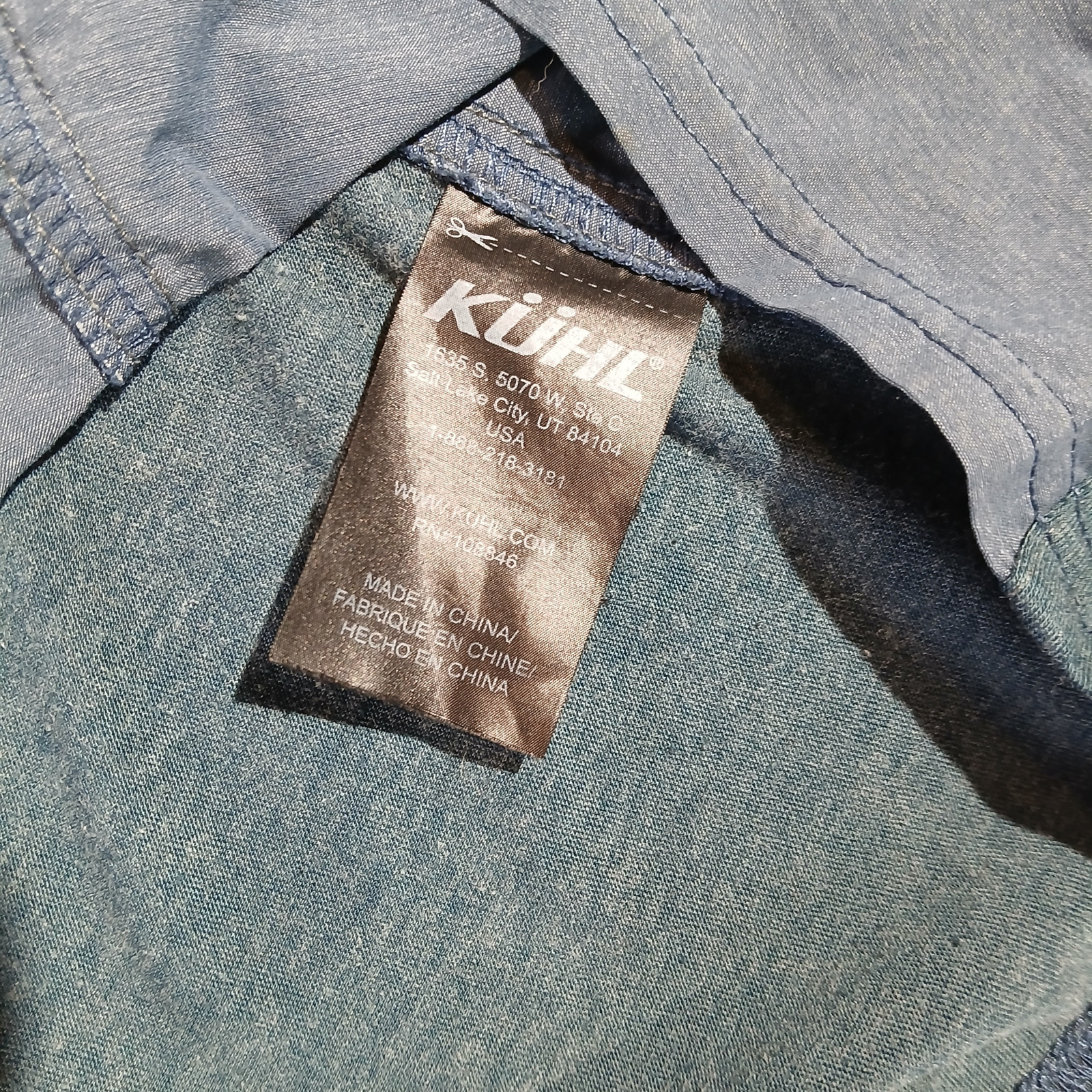 The Kuhl Airspeed Long Sleeve Button Shirt in Men's Size Large features a solid blue color and is made of polyester and nylon. This outdoor-themed shirt is designed with a collared neckline, button closure, and convenient pockets. Machine washable, it offers a regular fit for casual occasions during all seasons. Perfect for the great outdoors, this button-up shirt from a trusted brand like Kuhl is a versatile and stylish addition to any man's wardrobe.