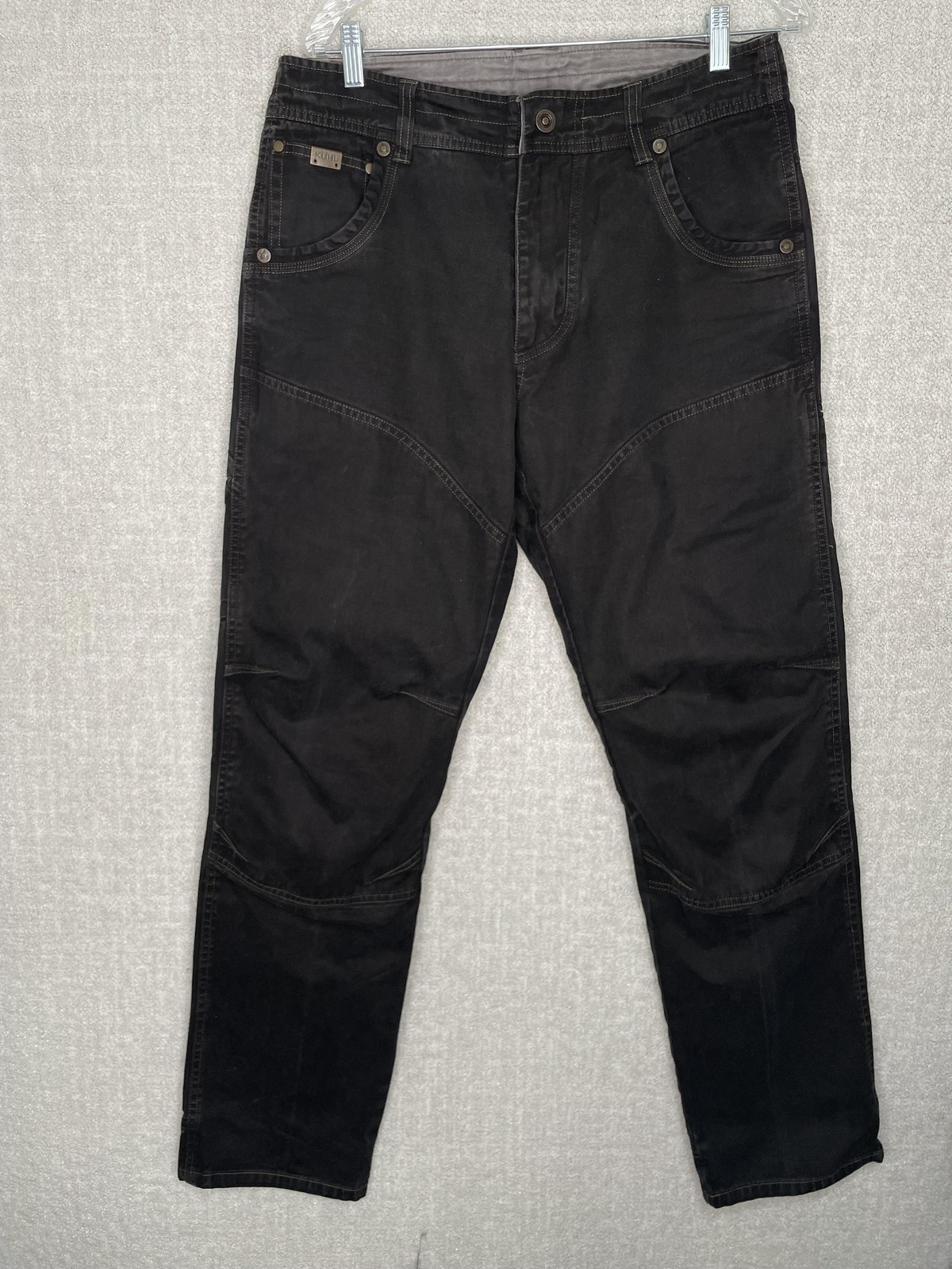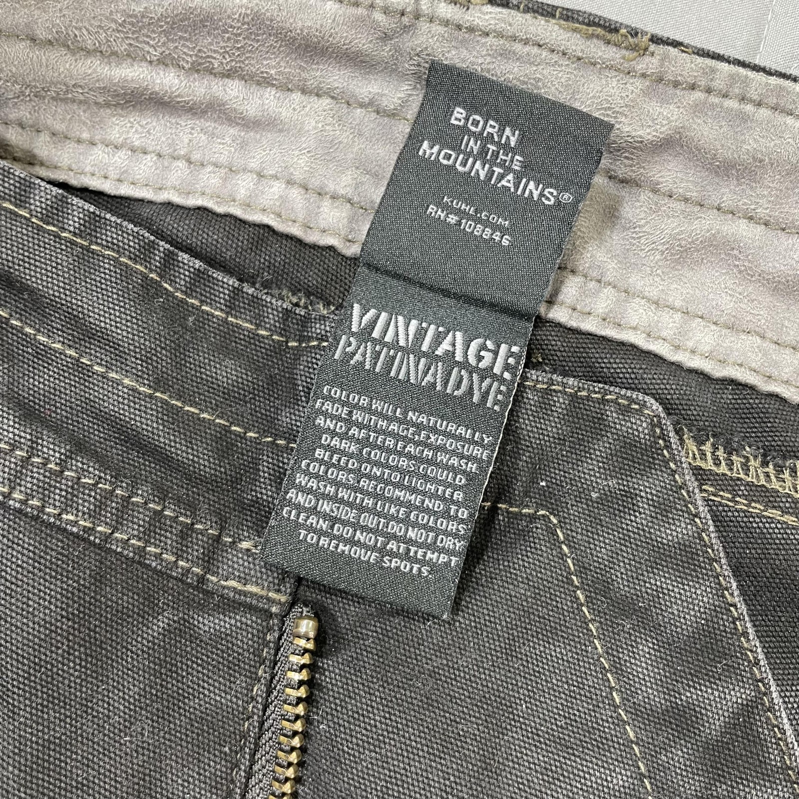 Kuhl Pants Mens 32x34 Black Vintage Patina Dye Stretch Workwear Outdoor Hiking Condition: Good, gently worn with some minor fading from wash and wear, no major flaws observed Material: 98% Cotton, 2% Lycra for stretch and comfort Features: Articulated knees for better movement, reinforced stitching, multiple workwear-style pockets including zippered side pocket, classic five-pocket design, metal rivet accents Branding: Kuhl metal logo patch front and logo embroidery at back pocket Tag and Style: Labeled size 32x34, "Vintage Patina Dye" effect, model 5111, RN#108846 Made in China Great for hiking, outdoor work, or casual everyday wear