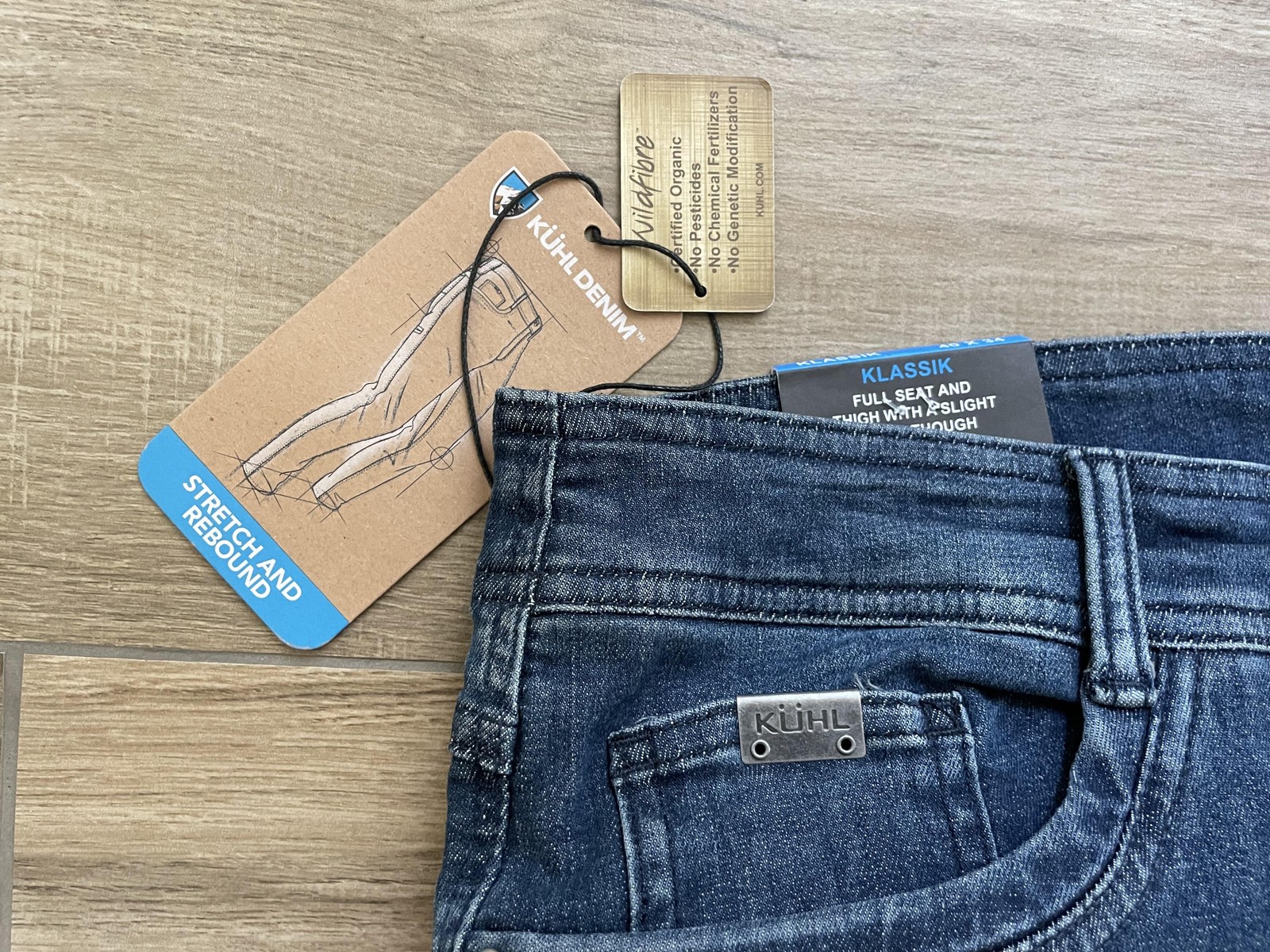 Kuhl Jeans Mens 40x34 Blue Denim Klassik Fit Stretch Rebound Wildfibre Organic Pants Condition: Brand New with Tags Kuhl Klassik fit—full seat and thigh with a slight taper through the lower leg Stretch and rebound denim for comfort and movement Made with Wildfibre certified organic cotton: no pesticides, no chemical fertilizers, no genetic modification Material: 58% organic cotton, 17% modal, 13% lyocell, 11% elasterell-p, 1% lycra Classic 5-pocket styling with additional branded Kuhl hardware on coin pocket Front button and zipper closure with branded Kuhl rivets Tag size: 40x34 (Mens); waistband measures approximately 19" across flat, inseam approximately 34" Care: Indigo dye—will naturally age and fade, machine wash cold, tumble dry low, do not bleach Made in Pakistan High performance moisture wicking and articulated design for motion Perfect for casual wear, outdoors, hiking, or everyday comfort