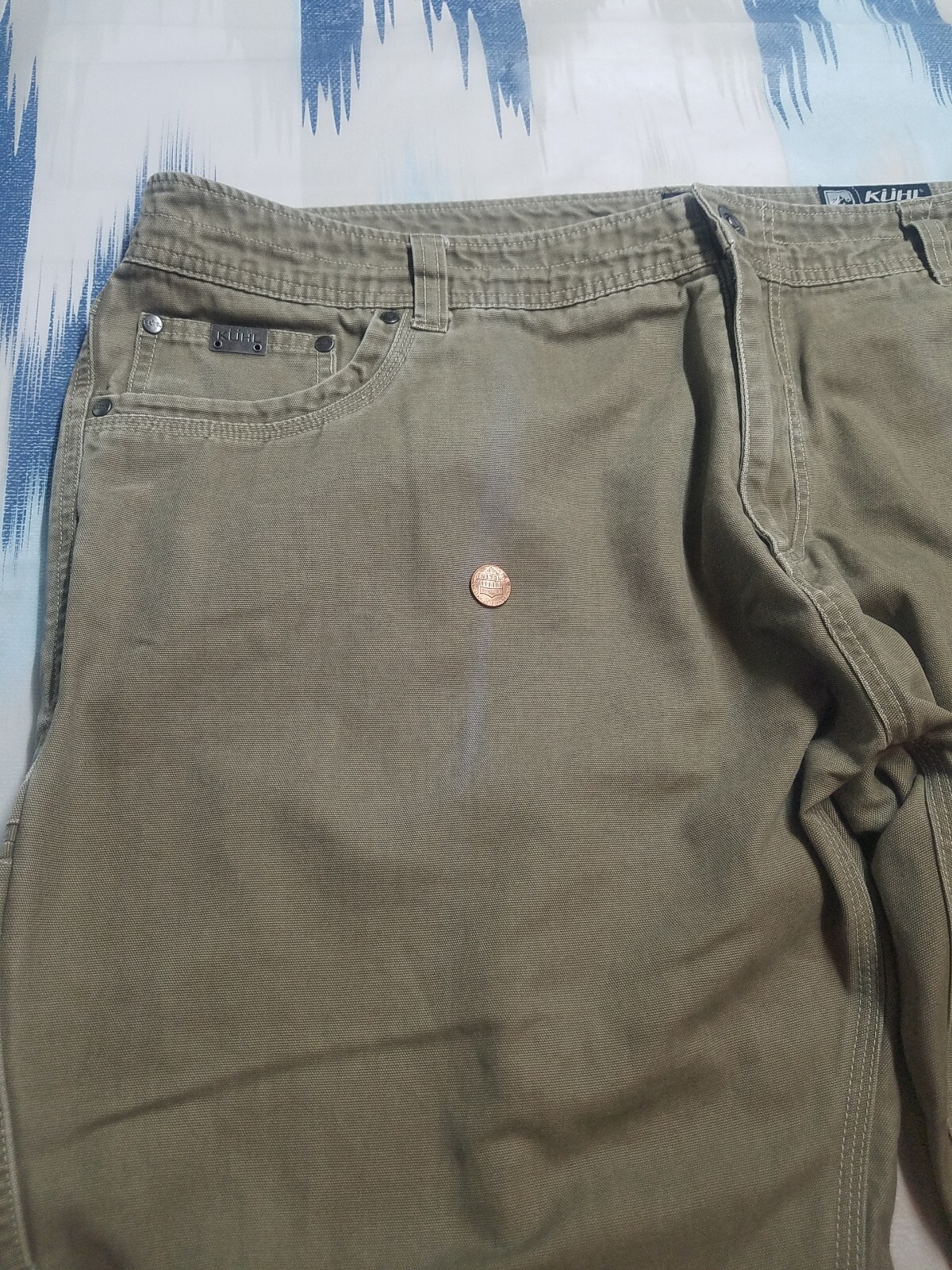 Kuhl Outkast Pants Mens 42X30 Green Vintage Patina Dye Hiking Pocket - Nice pants, notice fade on front of pants marked with penny. Other than fade these are still great pants. One picture i put tan pants in pic to show color, they look greenish to me. So see picture for color comparison. - Look closely at the pictures for detailed condition and measurements. - Thank you for looking! - Used clothes have been washed.