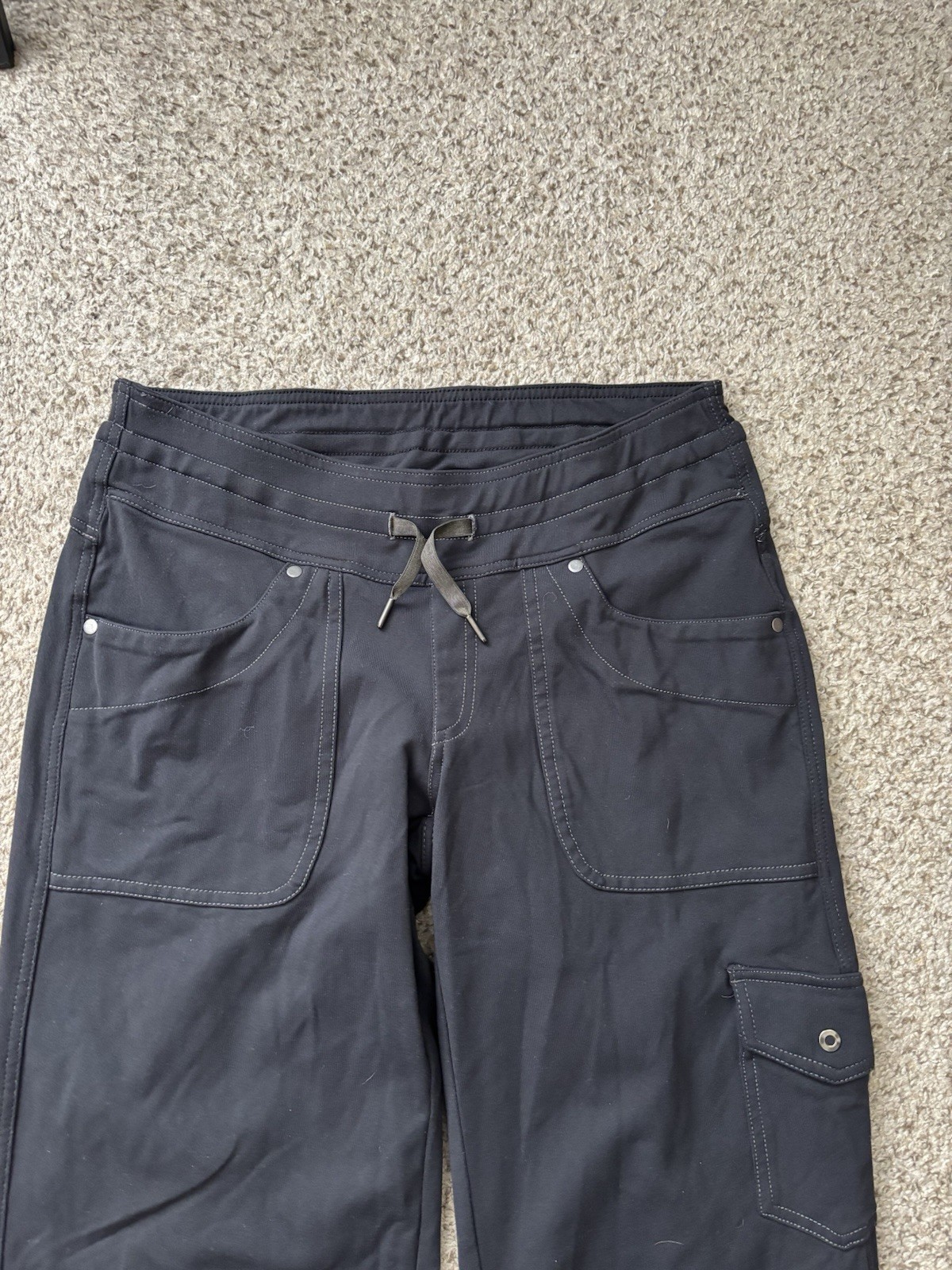 The Kuhl Women's Size 6 Short Dark Gray Mova Pants are perfect for hiking and outdoor activities. These cargo-style pants feature a drawstring closure, elastic waist, and quick-dry fabric for comfort and convenience. Made of nylon and spandex, they are designed for moisture-wicking and offer a low-rise fit with a straight leg. With multiple pockets and a solid gray color, these woven pants are versatile for all seasons and occasions. The Kuhl brand is known for quality and durability, making these pants a reliable choice for any adventure.