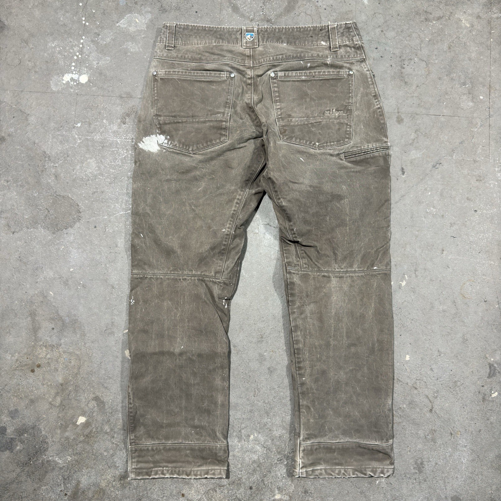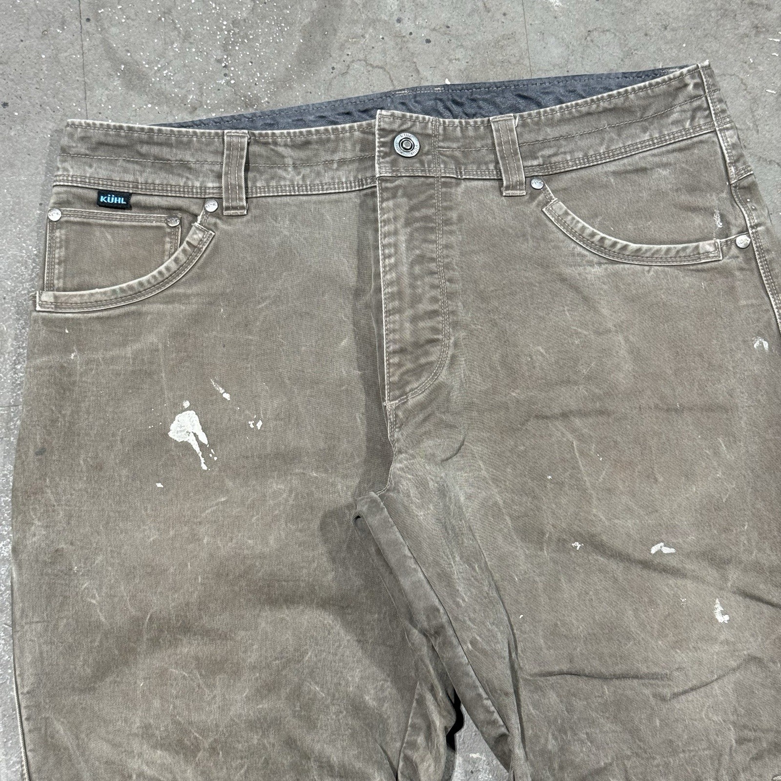 The Kuhl Ryder Pants in Men's size 34x30 are a versatile option for both casual and workwear occasions. Made from a durable canvas fabric with a stretch feature, these gray pants are perfect for any season. The distressed patina dye adds a rugged touch to the design, while the zip and snap closure ensures a secure fit. The mid-rise waist and straight leg style provide a comfortable and flattering fit for the modern man on the go.