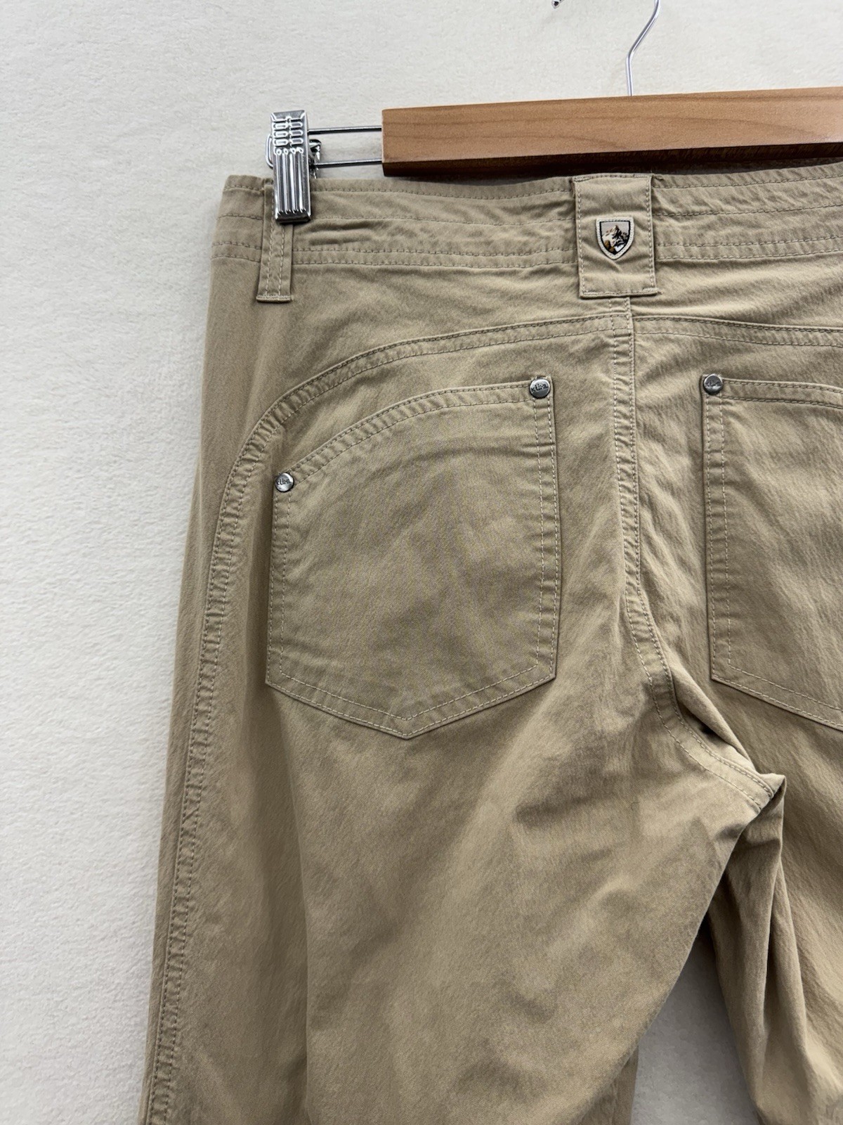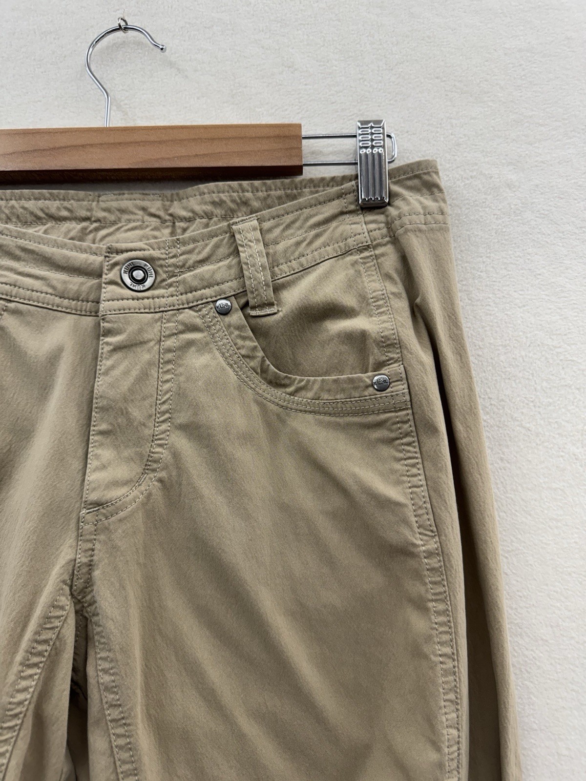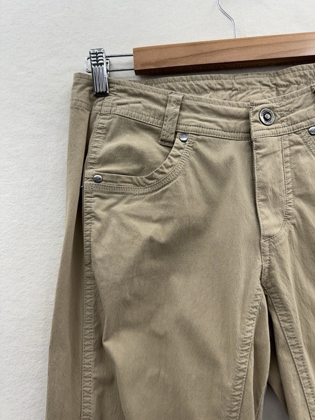The hem has been let out and sewn back up badly in my opinion, can easily be removed and redone to look better. Otherwise the pants are in excellent condition. The Kuhl Trekr Hiking Pants for women in size 6 is a lightweight and comfortable option for outdoor activities. Made of a blended fabric of polyester, nylon, and spandex, these beige pants feature a button closure, straight leg style, and multiple pockets for convenience. With a regular fit and 30-inch inseam, these pants are perfect for walking, climbing, fishing, and other outdoor adventures during the summer, fall, and spring seasons. Easy to care for with machine washable instructions, these pants offer both style and functionality for the modern outdoor enthusiast.
