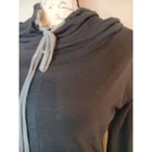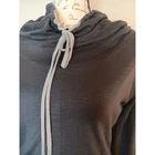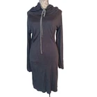This size small dress measures 34" in length from the top seam of the shoulder to the bottom hem, 16.5" from pit to pit and 14.25" at the waist. It is dark gray on the outside and the inside is a lighter gray. It has a cowl neck with a string hoodie. Please see all photographs as they are part of the description. Shipped with USPS Ground Mail.