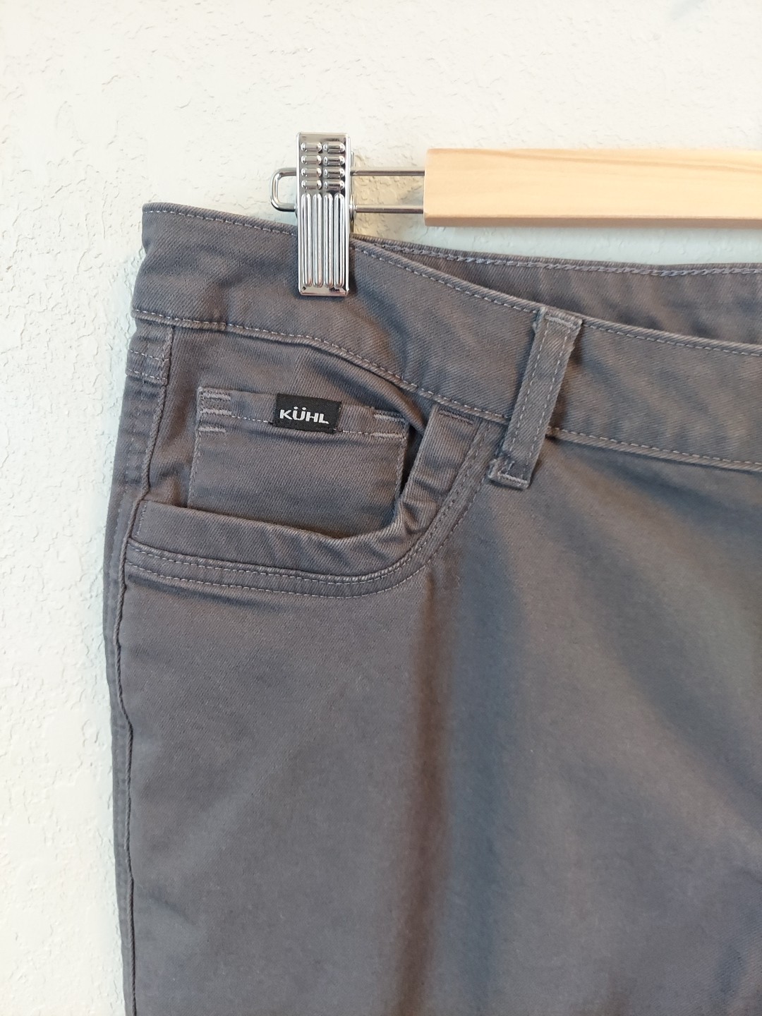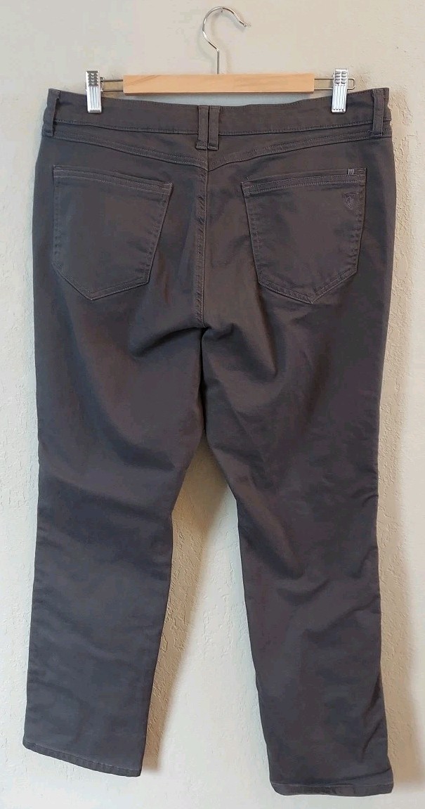 These Kuhl women's size 16 grey pants are perfect for outdoor activities like hiking and camping. Made of durable nylon material, they feature a zip closure, pockets, and a stylish khaki design. Easy to care for with machine washable garment care, these pants are designed for performance and comfort in all your outdoor adventures. The KÜHL Revolvr product line ensures quality and functionality, making these pants a reliable choice for the outdoor enthusiast.