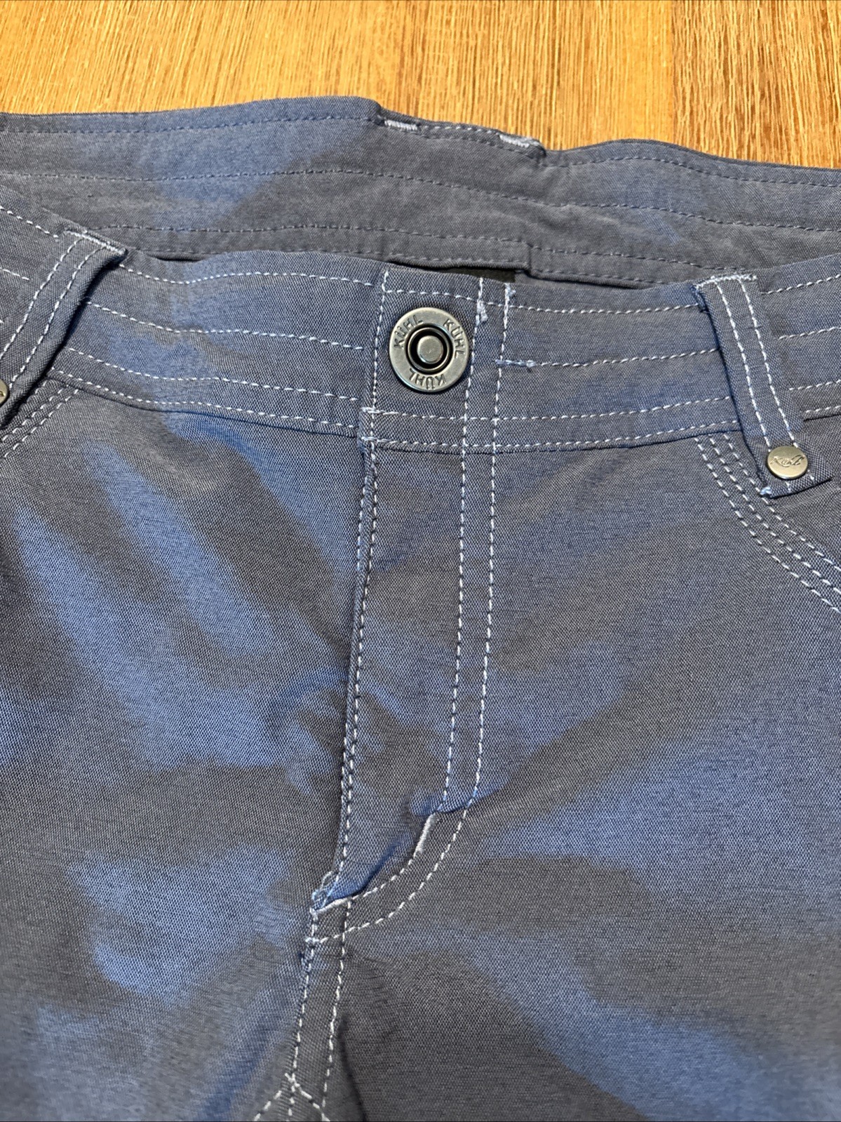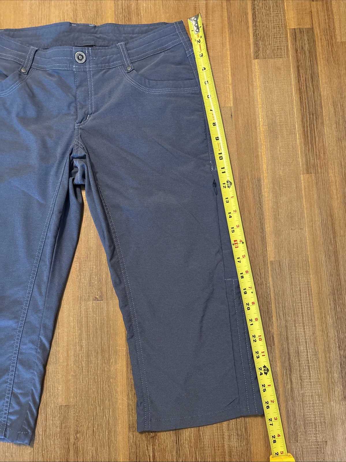 The Kuhl Women's Size 8 Blue Hiking Pants are designed for outdoor activewear with a focus on functionality and style. These cropped capri pants feature zip pockets on side of legs and snap button close on rear pockets for convenience and a versatile gray color perfect for hiking. The Kuhl brand is known for quality and performance, making these pants a reliable choice for any outdoor adventure.