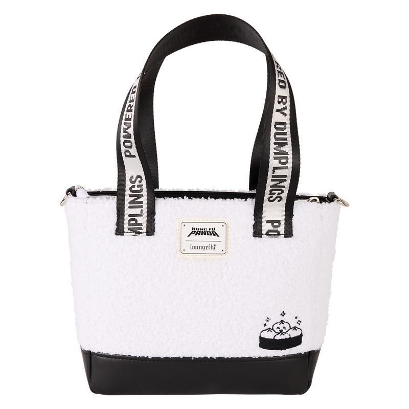 Po is embroidered on the front of this tote bag against a sherpa background. He shows off his Kung Fu. On the other side, you'll find embroidered dumplings. The strap says "Powered by Dumplings." (We, too, are powered by dumplings.) With plenty of space to store what you need, show off your love for Kung Fu Panda with this bag! Features Sherpa tote bag with faux leather (polyurethane) trim Sturdy top handles Adjustable, removable crossbody strap Embroidered and printed details Coordinating interior lining Dimensions: 12"W x 9"H x 4"D 30.4cm W x 22.8cm H x 10cm D
