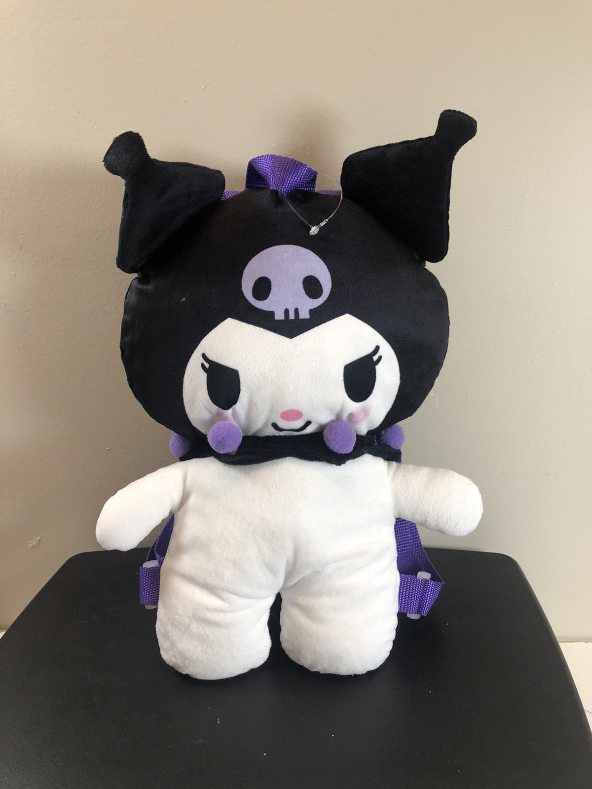 Sanrio Kuromi Plush Backpack Black White Skull Character Bag Condition: New with tags Shipping: Buyer pays shipping Handling: 1 business day • Bullet-Point Highlights Authentic Sanrio licensed Kuromi plush backpack Soft, high-quality polyester plush construction Black “skull” hood with lavender skull emblem & pom-pom accents Adjustable purple straps for a comfortable fit Measures approx. 12″H × 8″W × 4″D—perfect for kids or collectors • Product Description Bring home everyone’s favorite mischievous Sanrio character! This adorable Kuromi plush backpack features a soft white body, black hood with her signature lavender skull, and sweet rosy cheeks. It’s the perfect accessory for school, travel, or display on your shelf. Durable stitching and adjustable straps ensure it’s both functional and collectible. • Small Business Note Your purchase supports a family-run reselling business. Thank you for shopping small and making our day! Shipping & Returns • Ships within 1 business day via USPS Priority Mail (buyer pays). • 30-day returns accepted (buyer pays return shipping).