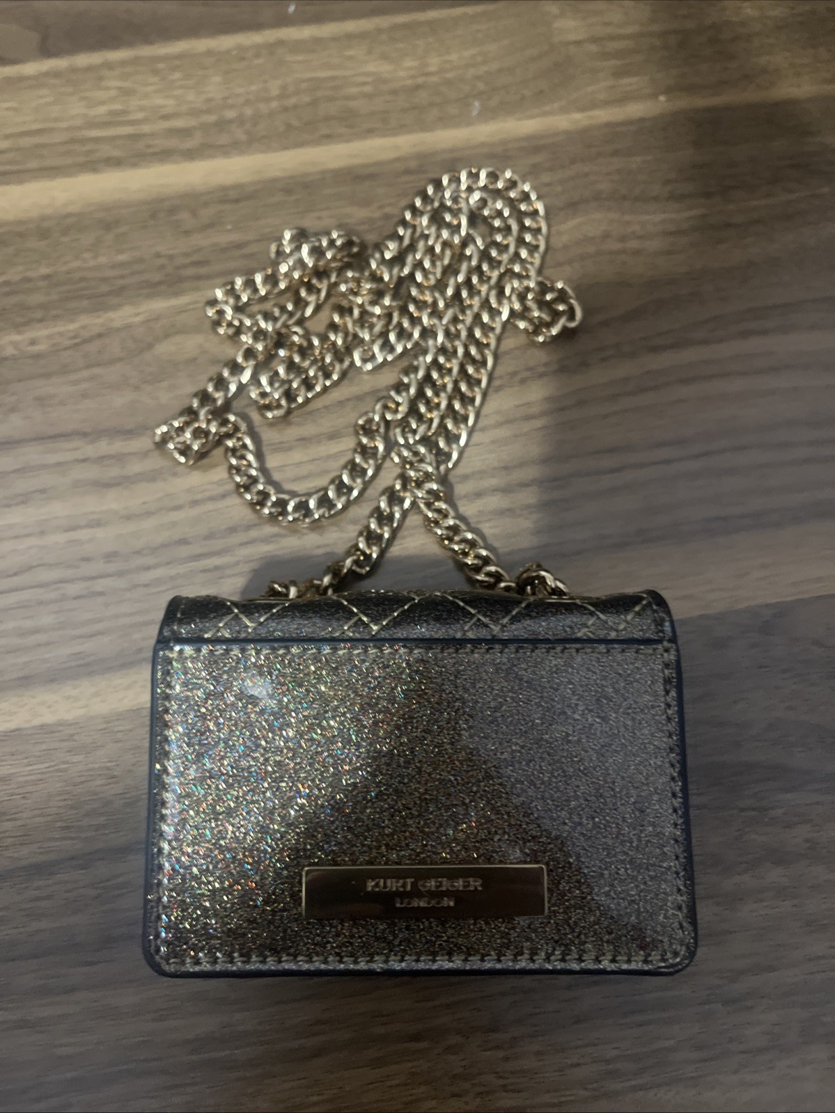 The Kurt Geiger London crossbody bag features a rectangular shape with a small size and a quilted finish in brown gold leather. It has a snap closure and a gold hardware color with crystal accents. The bag includes a chain strap for easy accessorizing and comes with an original dust bag. It is perfect for women who appreciate London-inspired accessories and want to add a touch of luxury to their outfit. Made by the renowned brand Kurt Geiger, this stylish and chic handbag is a must-have for any fashion-forward individual.