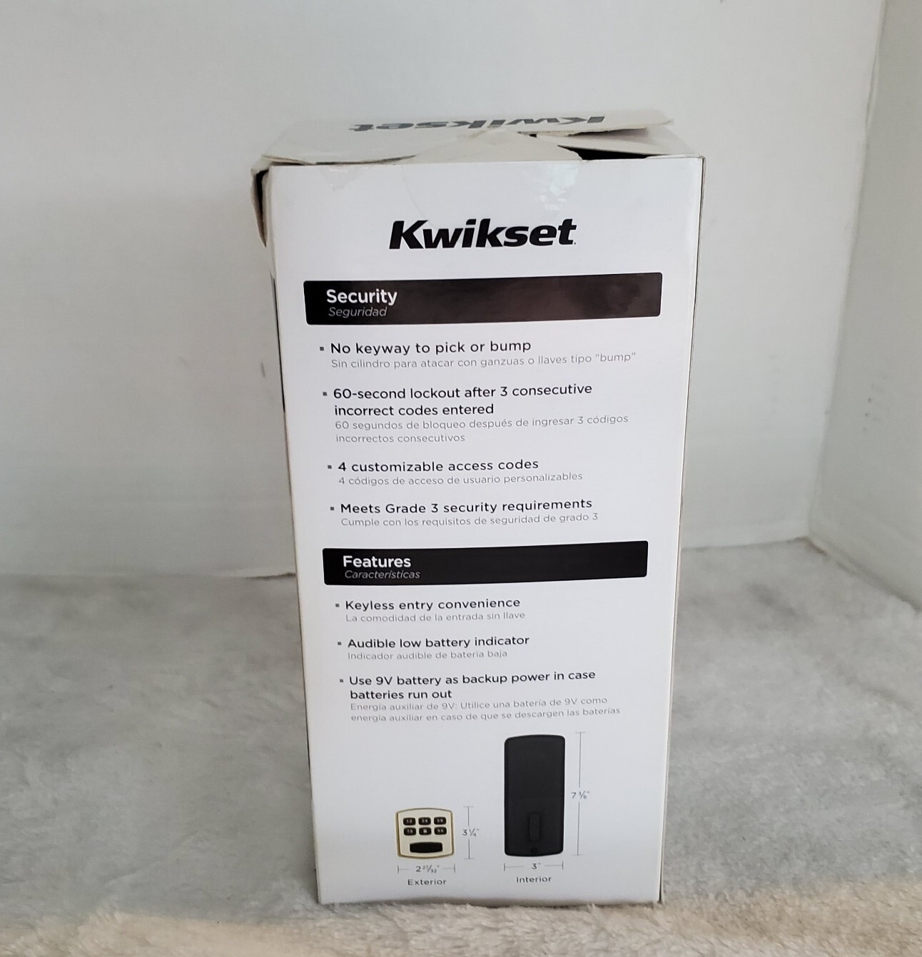 Kwikset 99050-002 Deadbolt Keyless Entry Touchpad Electronic Keypad Deadbolt. Installs Easily And Quickly. Fits 1 3/8" - 1.75" Door Thickness And Fits Left And Right Hand Doors. Fits Standard 2 1/8" Bore Holes. Customizable Access Codes. Requires 4 AA Batteries, NOT INCLUDED. Package Shows Wear, However This Item Was Never Out Of The Box.
