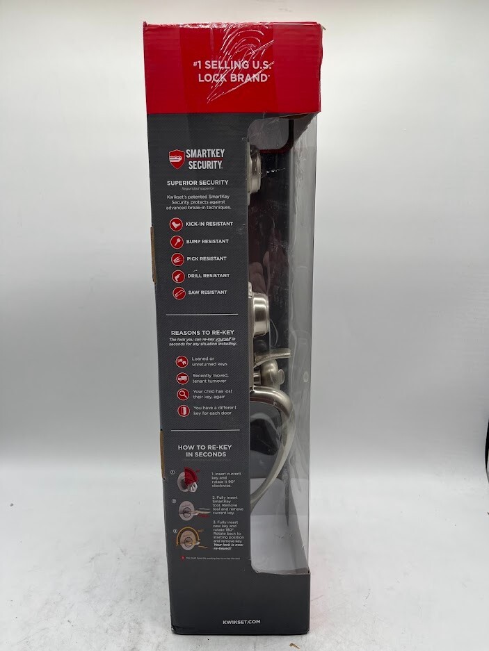 Enhance the style and security of your front door with the Kwikset Montara Handleset from the Signature Series. Designed for both elegance and durability, this handleset features two locking points for superior protection and SmartKey Security technology for quick and easy re-keying. With a Satin Nickel finish and an arched design, it brings a clean, modern look to your home’s exterior. Key Features Enhanced Security : Dual locking points: One on the deadbolt and another on the handleset for extra protection. ANSI/BHMA Grade 2 security rating for high-quality residential safety. SmartKey Re-Key Technology : Easily re-key the lock yourself in just 3 steps. Compatible with Kwikset (KW1) keyway. BumpGuard technology protects against lock bumping for added peace of mind. Ease of Installation : Fully adjustable latch fits all standard door preparations. Adjustable bottom through-bolt ensures a perfect fit on pre-drilled doors. Fits door thicknesses of 1-3/4 inches and installs in minutes with just a screwdriver. Sleek and Stylish Design : Satin Nickel finish offers a crisp, clean, and modern look. Arched design complements a variety of home styles. Specifications Finish : Satin Nickel Lock Type : Single cylinder deadbolt with thumb turn inside and key access outside. Compatibility : Fits doors with a thickness of 1-3/4 inches. Installation : Requires only a screwdriver for simple, hassle-free setup. Security Grade : ANSI/BHMA Grade 2. We take great care to inspect all items and ensure they are accurately described. Should you have any issues with your purchase, please let us know immediately. We are committed to resolving any concerns promptly and to your satisfaction. Our small business truly appreciates your patronage.