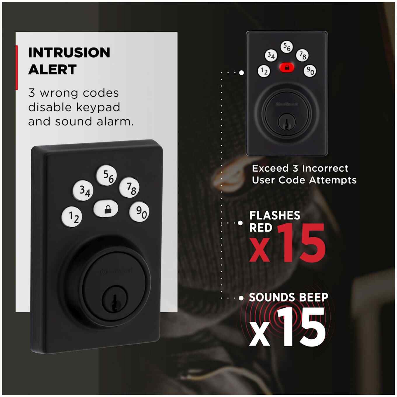 Kwikset Powerbolt 240 Contemporary Single Cylinder Keyless Entry Deadbolt with 5-Button Keypad in Matte Black Model: 9240CNT-514 Single Cylinder Keyless Entry: Lock and unlock the deadbolt using your cell phone, smart device or a traditional key. To lock or unlock the interior, simply use your device or the standard thumb turn. It has the versatility of keyless operation while still retaining the functionality of keyed entry and is a great addition to any smart home. It's perfect for front doors, side or back doors, and garage entry doors. Features: Tested to exceed ANSI/BHMA Grade 3 security requirements Constructed of high quality steel for durability and dependability Up to 12 user codes Convenient one touch locking Brightly lit keypad makes it easy to enter your code at any time Wrong code alarm after 3 attempts with 1 minute lockout Programmable auto lock, set for 30s, 1m, 3m, 5m, or 10m Vacation mode disables keypad for when you leave town Long lasting 12-month battery life Easy installation and BILT app support Specifications: Backset: Adjustable 2-3/8" or 2-3/4" Cross Bore: 1-1/2", 2-1/8" Edge Bore: 1" Door Thickness: 1-3/8" to 2-1/4" Interior Height: 5-1/2" Interior Width: 2-3/4" Interior Projection: 1-1/8" Exterior Height: 4-7/16" Exterior Width: 2-3/4" Exterior Projection: 1" Latch Faceplate: Round Corner Cylinder: 5 Pin KW1 Check eValues store for more items like this!