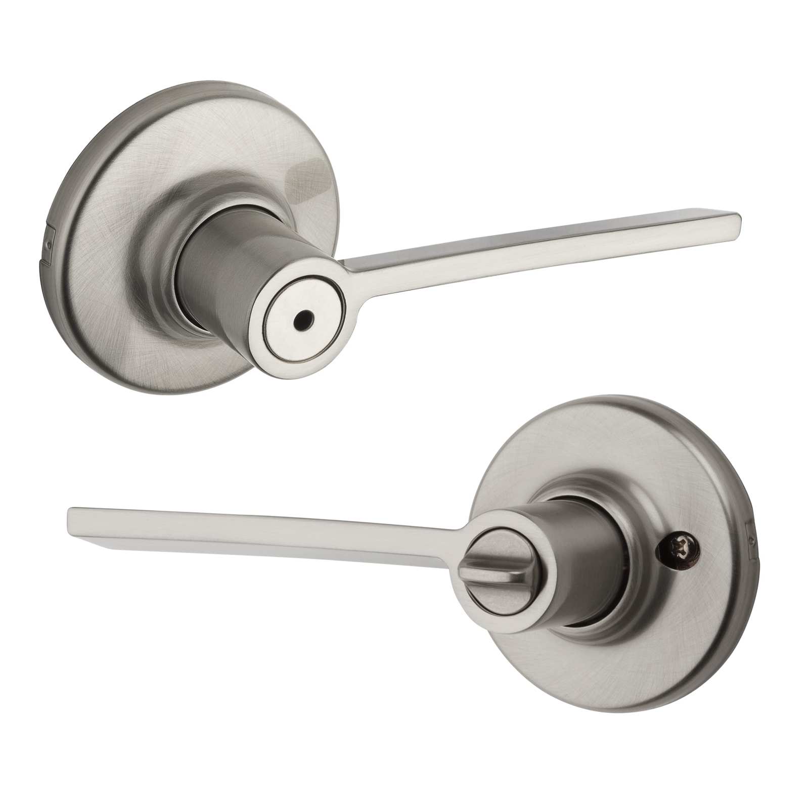 Kwikset Privacy Door Handle SatinNickel Reversible Keyless Push Button Lock Door Features LOCKING PRIVACY: Use on doors requiring privacy, can be locked inside with a push button and unlocked outside with provided release tool, recommended for bedrooms and bathrooms EASY INSTALL REVERSIBLE LEVER: Do it yourself, installs in minutes with just a screwdriver. Reversible handle for left- or right-handed doors, detailed directions provided FITS STANDARD DOORS: Fits standard size doors 1-3/8" to 1-3/4" thick, adjustable latch backset from 2-3/8" to 2-3/4" with just a twist during installation BOX INCLUDES: Exterior and Interior Levers, Screws, Adjustable Latch, Strike Plate, Emergency Unlock Tool, Installation Hardware, Install Guide CERTIFIED TRUSTED QUALITY: Security, Durability and Finish are Grade 3 BHMA certified, designed for reliable protection, providing peace of mind at home WARRANTY PROTECTION: Our products are backed by a lifetime mechanical and finish warranty with great customer service, see Kwikset warranty for more details MICROBAN PROTECTION: Kwiksets door hardware is treated with Microban, this offers powerful product protection that is 99.9% cleaner than an unprotected surface CONTEMPORARY DESIGN: Available in a sophisticated, modern door hardware style with simple, unique details to match your home dcor Fast and Free Shipping You're already purchasing the item. Why pay additional for shipping, especially slow shipping? We get your order shipped out within 1-business day and delivered to your doorstep as quickly as possible. Competitive Pricing With our dynamic pricing model, our prices are always competitive. Our prices are some of the lowest that you will find on the internet. Rest assured that you're getting a good deal when purchasing with us. 30-day Money Back Guarantee We are committed to making sure that you leave this transaction satisfied. If you're unhappy with the product for any reason, you may return it back for your money-back or a replacement within 30 days. No questions asked!