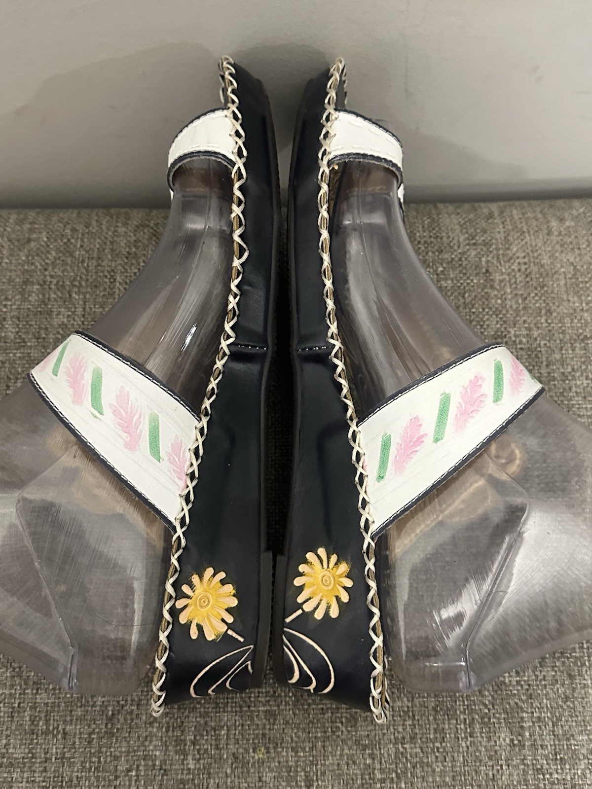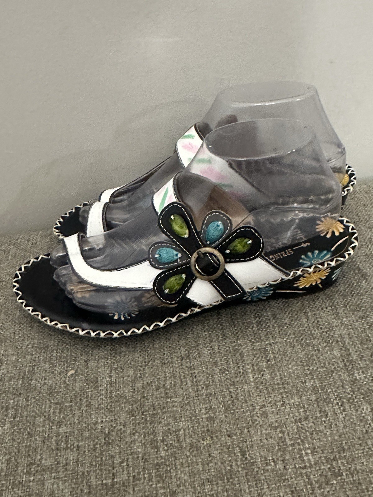 The L Artiste Springstep Floral Multi Colored Thong Wedge Sandals in size 39 (UK 8.5) are a stylish and comfortable choice for women. With a slip-on design, low wedge heel, and vibrant floral pattern, these sandals are perfect for a casual day out. Made from leather with a standard shoe width, these sandals offer both style and comfort for a variety of outfits. The multicolor design and thong style add a fun and trendy touch to any ensemble, making them a versatile addition to any wardrobe. Preowned Good Condition