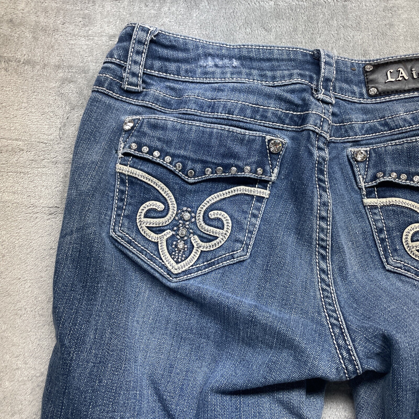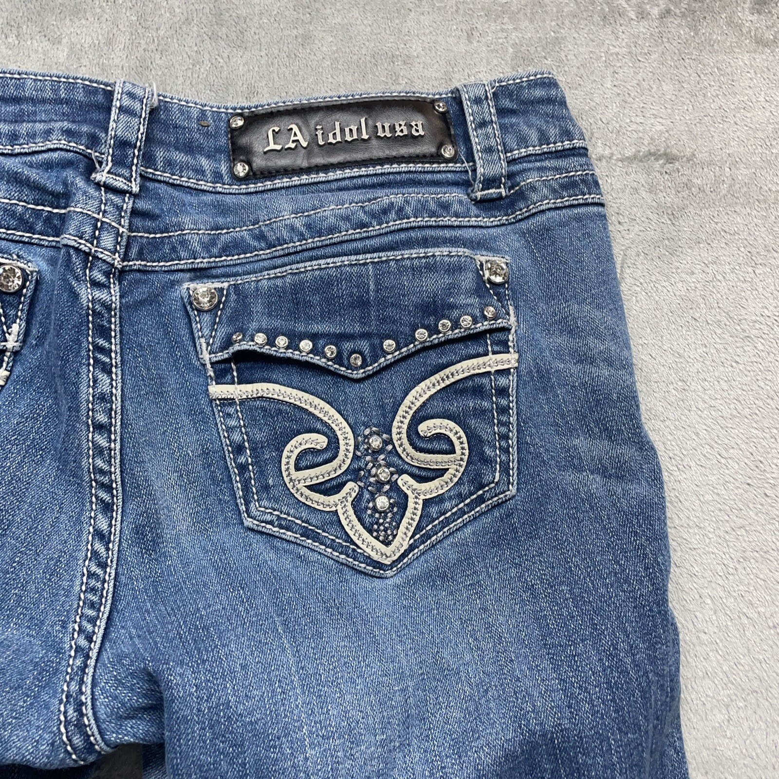 These jeans are a fantastic find—super stylish with the thick stitching and studded details that make them stand out. The bootcut fit is flattering and classic, and the 31x34 inseam is perfect for taller frames. They’re in great condition, sturdy yet comfortable, and the pockets add a fun touch. Love the LA IDOL USA brand quality—definitely worth it!