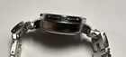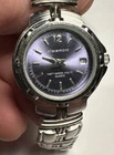 This ladies Claremont wristwatch features a light purple dial with non-numeric hour marks and a 12-hour dial, as well as a date indicator and central second. The watch has a silver colored case and bezel, and a 25mm case size. The band is made of stainless steel alloy and measures 8 inches in length. The watch is powered by a quartz battery movement and has a water resistance of up to 100ft. Overall good condition Minor scratches on bezel New Battery- tested and running