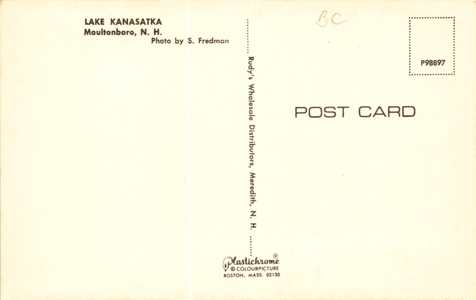 MAKE AN OFFER. THE MORE YOU BUY THE BETTER DEAL I WILL ACCEPT The postcard features a photo of Lake Kanasatka in Moultonboro, New Hampshire, taken by S. Fredman. The distributor mentioned is Rudy's Wholesale Distributors in Meredith, New Hampshire. The postcard is a Plastichrome print by Colourpicture in Boston, Massachusetts.