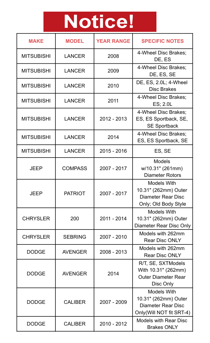 Store Categories Store Categories Air Filter Brake rotors and brake pads Catalytic Converter Suspension Parts Brake rotors Brake Pads Other Details For LANCER COMPASS 200 SEBRING CALIBER Rear Disc Brake Rotors and Brake Pads Rear Drilled and Slotted Brake Rotors & Ceramic Pads Kit 2x - Drilled & Slotted Disc Brake Rotors : 53036 4x Ceramic Brake Pads : D1037 Specifications: For Both Driver & Passenger Side Cast from OE Grade Alloy Machined to OE Specs Direct Replacement 5-Lug Wheel Holes D urable Coating protects against harmful corrosion & rust Models With 10.31" (262mm) Outer Diameter Rear Rotors FITS MAKE MODEL YEAR RANGE SPECIFIC DETAILS MITSUBISHI LANCER 2008 4-Wheel Disc Brakes; DE, ES MITSUBISHI LANCER 2009 4-Wheel Disc Brakes; DE, ES, SE MITSUBISHI LANCER 2010 4-Wheel Disc Brakes; DE, ES; 2.0L MITSUBISHI LANCER 2011 4-Wheel Disc Brakes; ES, ES Sportback; 2.0L MITSUBISHI LANCER 2012 - 2013 4-Wheel Disc Brakes; ES, ES Sportback, SE, SE Sportback MITSUBISHI LANCER 2014 4-Wheel Disc Brakes; ES, ES Sportback, SE MITSUBISHI LANCER 2015 - 2016 ES, SE JEEP COMPASS 2007 - 2017 Models With 10.31" (262mm) Rear Disc Only JEEP PATRIOT 2007 - 2017 Models With 10.31" (262mm) Rear Disc Only; Old Body Style CHRYSLER 200 2011 - 2014 Models With 10.31" (262mm) Rear Disc Only CHRYSLER SEBRING 2007 - 2010 Models with 10.31" (262mm) Rear Disc ONLY DODGE AVENGER 2008 - 2013 Models With 10.31" (262mm) Rear Disc Only DODGE AVENGER 2014 R/T, SE, SXT Models With 10.31" (262mm) Rear Disc Only DODGE CALIBER 2007 - 2009 Models With 10.31" (262mm) Rear Disc Only (Will NOT fit SRT-4) DODGE CALIBER 2010 - 2012 Models With 10.31" (262mm) Rear Disc Only Terms of sales Shipping Policy Payment Method Returns Policy Terms of sales • Please leave us a good rating after you have received the item and are happy with our transaction. If there are any issues, please contact me first before leaving a neutral, negative or 5 star rating. Customer Satisfaction is our top priority!! We promise we can make you happy if you give us a fair chance. Thanks and happy bidding! • Anyway, if you have any troubles,please feel free to contact us.We're willing to do anything resonable to help you out.Please do not leave any negative or neutral feedback before letting us know. Thanks! Shipping Policy • Items are usually shipped out within 24 hours during the business days after payment has been received. (except Saturday and Sunday).Delivery Time is about 4-7 business days to most of regions. We are not responsible for any wrong or undeliverable addresses. Please verify and update your shipping address on eBay during checkout. Payment Method • PayPal Preferred, Credit or debit card through PayPal. Returns Policy • All returned products (Replacements or Refund) need to be assigned an RMA # (Return Merchandise Authorization #) prior to return. Please contact us through eBay's messaging system to obtain an RMA# for the return. Any returned product without an RMA # on package will not be accepted or processed. Warranty Warranty • All of our brand new items come with a 30-60 Days money-back guarantee. We define the item as defective only if it doesn't function as described. • It is the buyer's responsibility to understand the item description before bidding. We will replace the defective items, provided that they are in stock within the warranty period posted with the listing. We will refund the purchase price if the replacement is not available or buyer prefers a refund and send the original item back at his/her own cost. • The guarantee will be only for the cost of the item, we will not responsible for installation or other fees like labor expenses, towing expenses, additional repair expenses or other related expenses. About us About us • We have developed long-term relationships with world-renowned suppliers to ensure our products meet the highest industry standards. Whether it's wheel Hub, drivetrain or brake components, we offer a wide range of product lines to suit a variety of makes and models. Whether you are a garage, a car owner or a car enthusiast, we offer personalised advice based on your needs to ensure you choose the most appropriate parts. Copyright©2023 One-topauto20 Store Categories Store Categories Air Filter Brake rotors and brake pads Catalytic Converter Suspension Parts Brake rotors Brake Pads Other Details For LANCER COMPASS 200 SEBRING CALIBER Rear Disc Brake Rotors and Brake Pads For LANCER COMPASS 200 SEBRING CALIBER Rear Disc Brake Rotors and Brake Pads Rear Drilled and Slotted Brake Rotors & Ceramic Pads Kit 2x - Drilled & Slotted Disc Brake Rotors : 53036 4x Ceramic Brake Pads : D1037 Specifications: For Both Driver & Passenger Side Cast from OE Grade Alloy Machined to OE Specs Direct Replacement 5-Lug Wheel Holes D urable Coating protects against harmful corrosion & rust Models With 10.31" (262mm) Outer Diameter Rear Rotors FITS MAKE MODEL YEAR RANGE SPECIFIC DETAILS MITSUBISHI LANCER 2008 4-Wheel Disc Brakes; DE, ES MITSUBISHI LANCER 2009 4-Wheel Disc Brakes; DE, ES, SE MITSUBISHI LANCER 2010 4-Wheel Disc Brakes; DE, ES; 2.0L MITSUBISHI LANCER 2011 4-Wheel Disc Brakes; ES, ES Sportback; 2.0L MITSUBISHI LANCER 2012 - 2013 4-Wheel Disc Brakes; ES, ES Sportback, SE, SE Sportback MITSUBISHI LANCER 2014 4-Wheel Disc Brakes; ES, ES Sportback, SE MITSUBISHI LANCER 2015 - 2016 ES, SE JEEP COMPASS 2007 - 2017 Models With 10.31" (262mm) Rear Disc Only JEEP PATRIOT 2007 - 2017 Models With 10.31" (262mm) Rear Disc Only; Old Body Style CHRYSLER 200 2011 - 2014 Models With 10.31" (262mm) Rear Disc Only CHRYSLER SEBRING 2007 - 2010 Models with 10.31" (262mm) Rear Disc ONLY DODGE AVENGER 2008 - 2013 Models With 10.31" (262mm) Rear Disc Only DODGE AVENGER 2014 R/T, SE, SXT Models With 10.31" (262mm) Rear Disc Only DODGE CALIBER 2007 - 2009 Models With 10.31" (262mm) Rear Disc Only (Will NOT fit SRT-4) DODGE CALIBER 2010 - 2012 Models With 10.31" (262mm) Rear Disc Only 1. High-Performance Braking & Precision Cool