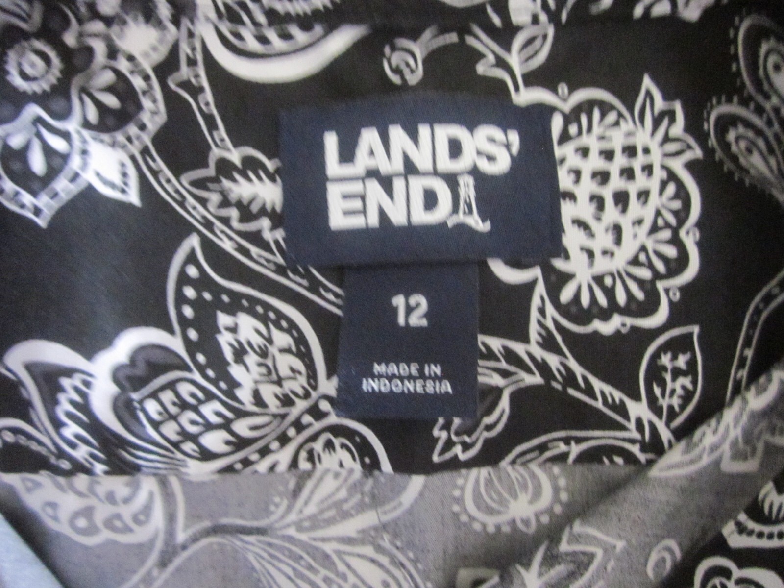 LANDS' END Black w/ White Flower Print Long Sleeve Button Front Shirt Top Sz 12