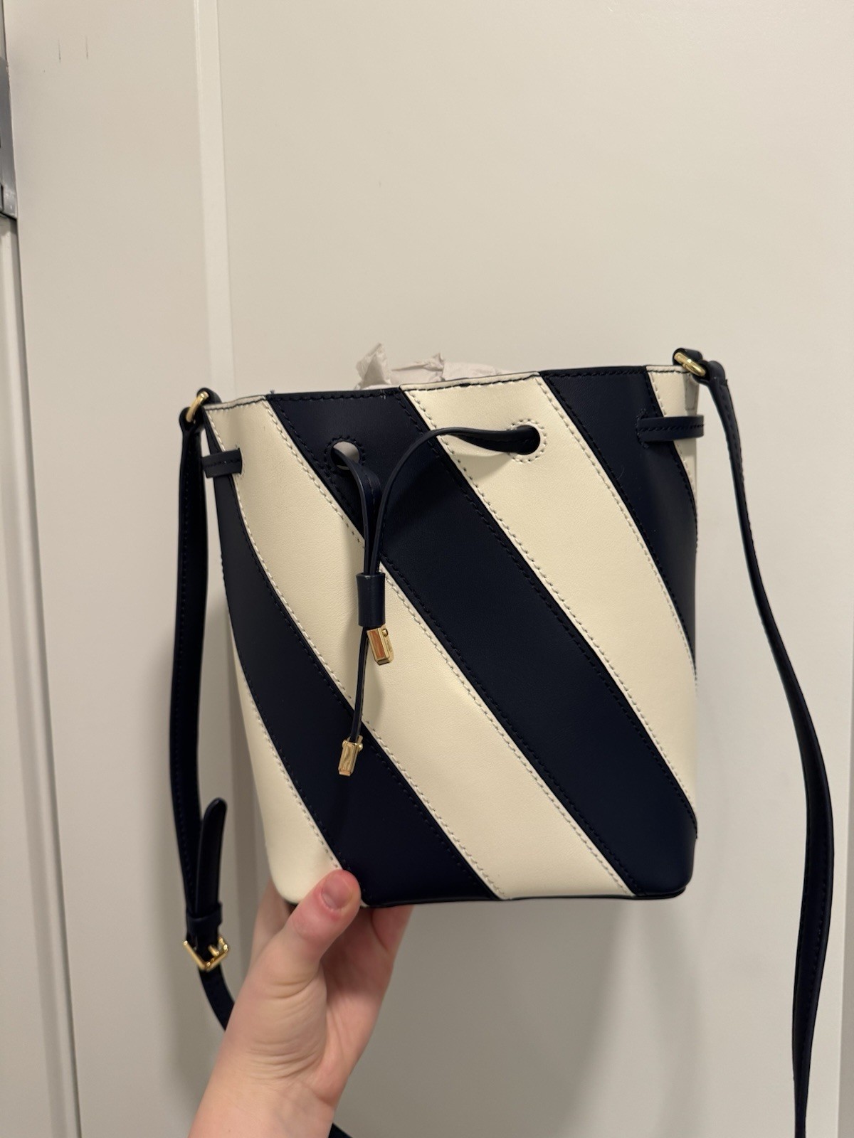 The LAUREN RALPH LAUREN Mini Debby II Navy & Vanilla Stripe Leather Purse Bag is a stylish shoulder bag designed for women. Made from leather with a striped pattern in navy blue and vanilla, this medium-sized purse exudes sophistication and elegance. The iconic Lauren Ralph Lauren brand ensures high quality and timeless design, making it a must-have accessory for any fashion-forward woman. Perfect for carrying essentials in a chic and classic manner.