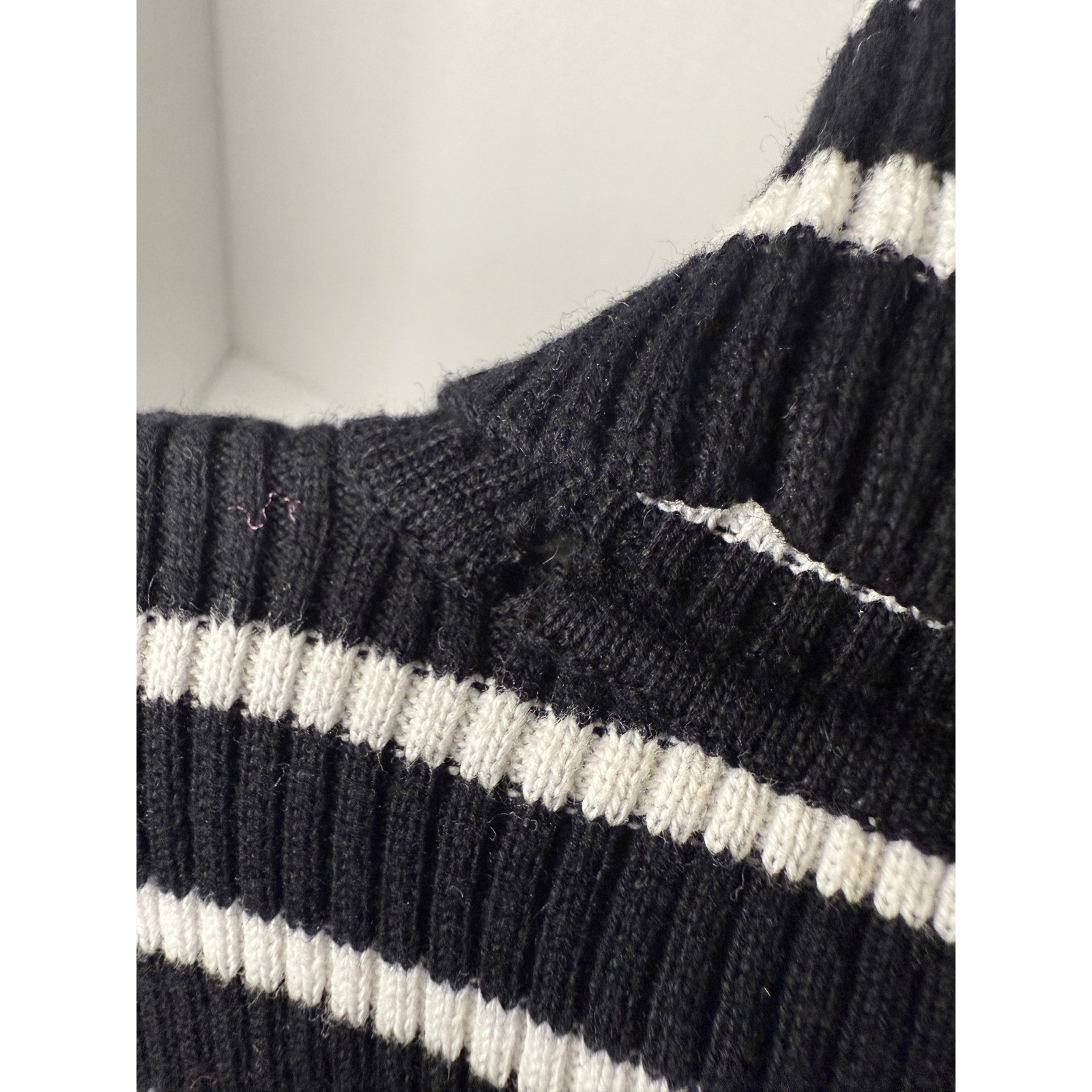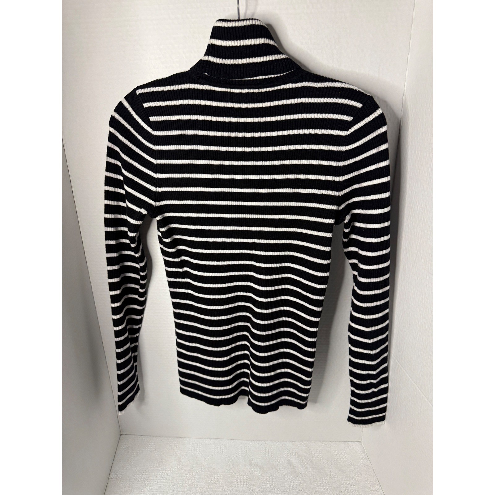 Please see photo of back of turtleneck there is a small pin size hole in pictures. Hole is covered up once turtleneck is pulled all the way down. Embrace classic style with this LAUREN RALPH LAUREN ribbed turtleneck sweater. The timeless black and white stripe pattern creates a chic and versatile look that effortlessly elevates any outfit. Its fitted silhouette hugs your curves for a flattering appearance, while the soft ribbed texture provides both comfort and warmth. The iconic RL logo detail on the collar adds a touch of subtle luxury. Perfect for layering under a blazer for a sophisticated office look or pairing with jeans for a stylish weekend outing. Style: Pullover Department: Women Material: Cotton Blend Neckline: Turtleneck Sleeve Length: Long Sleeve Type: Sweater Features: Stretch Pattern: Striped Fabric Type: Knit Accents: Logo Knit Style: Tight-Knit Season: Fall, Winter Fit: Slim Occasion: Casual Garment Care: Machine Washable Length-23 Inches Pit-15 Inches A28