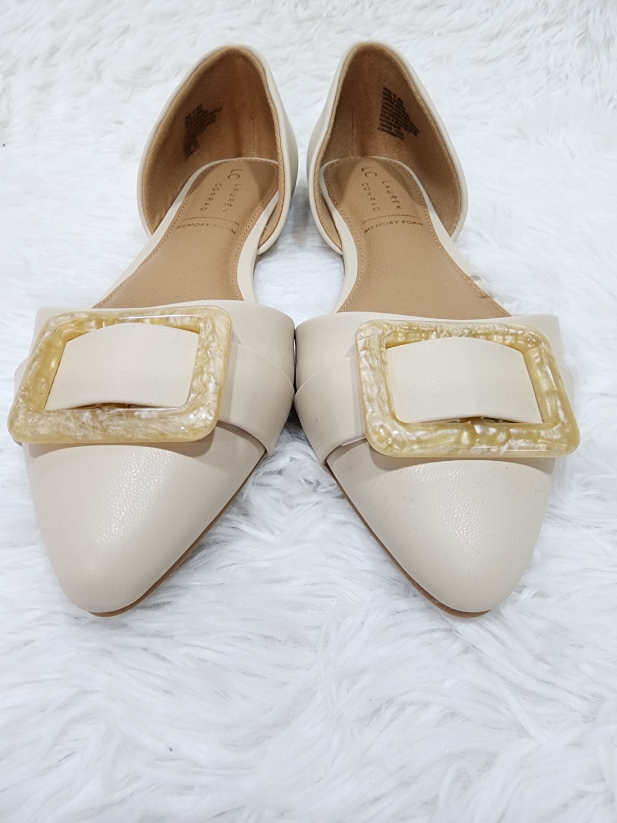 The LC Lauren Conrad Azra Cream Women's Dress Flats are stylish and comfortable flats designed for women. These size 11 flats feature a classic ivory color with a faux leather upper material, making them versatile for a variety of outfits. Ideal for everyday wear or special occasions, these flats from LC Lauren Conrad are a chic addition to any woman's shoe collection.