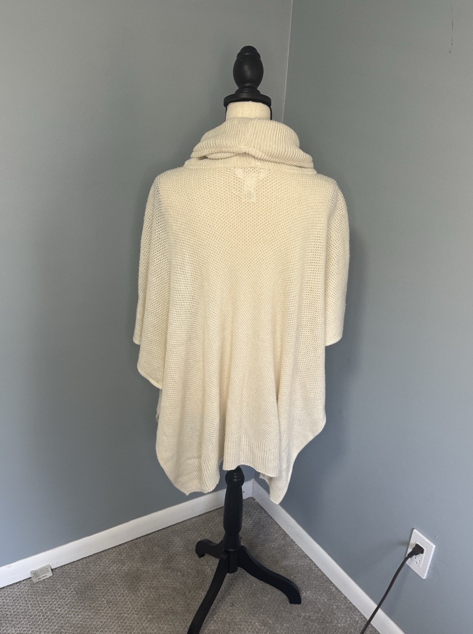 Stay warm and stylish with this cozy cream turtleneck sweater poncho. Perfect for layering and adding a touch of elegance to your wardrobe. EXCELLENT CONDITION! No signs of wear, stains or holes. *** Measurements (lying flat) *** P2P 37” Length (tip of collar to bottom top) 33”