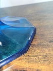 This beautiful vase from L.E. Smith's Blue Dominion collection is a stunning piece of hand-blown glass. With a glossy finish and a dominating blue color, it's sure to catch the eye of any Mid-Century Modern enthusiast. The vase measures 22 inches in height and has nine fingers, making it a unique and original piece. Crafted in the United States using traditional glass-making techniques, this vase is an impressive addition to any collection. The backstamp is impressed and the production style is stretch glass, adding to its authenticity. This original piece is perfect for displaying flowers or as a stand-alone decorative item.
