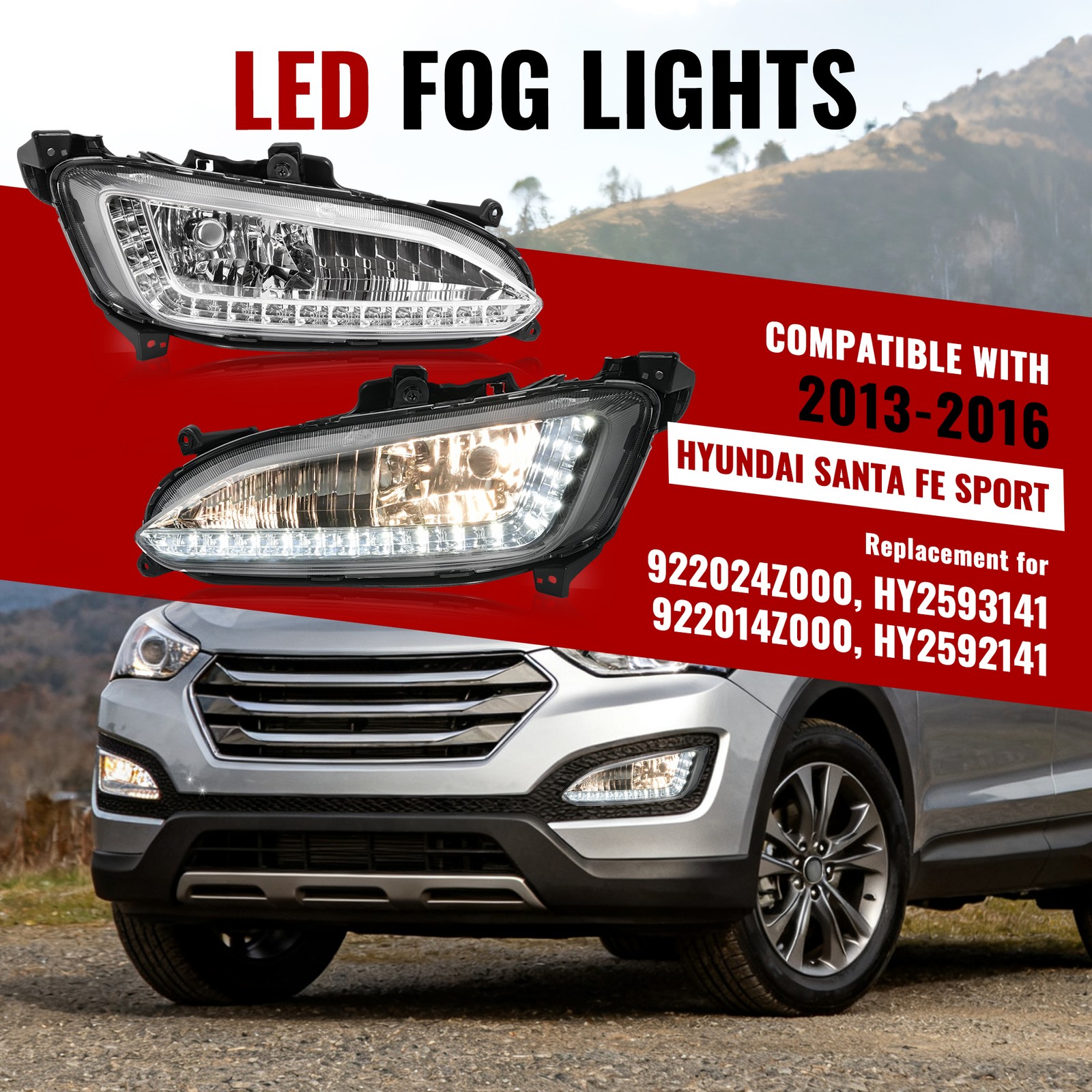 Headlight Assemblies Tail Light Assemblies Fog Light Assemblies Turn Signal Light Assemblies Side Marker Light Assemblies Park & Combination Light Assem Light Bulbs & LEDs Other Type Light Other Product Display Product Description LED DRL Fog Lights Lamps Assembly For Hyundai Santa Fe Sport 2013-2015 2016 FIT FOR: For Hyundai Santa Fe Sport 2013-2016 Product Specifics: Type:Fog Lights Lighting Technology: LED/Halogen Lens Color:Clear Lens Light Color:White Placement on Vehicle:Front,Left,Right Installation Method:Screw-ON Material:Plastic Items Included:Bulbs Replaces Part Number:Replace for 116-60198R,116-60199L,922024Z000,922014Z000,HY2593141,HY2592141,19603300,19603400,321-2030L-AF,321-2030R-AF,19-6033-00-1,19-6034-00-1 Features: Durable All-Weather Housing: Resists impacts, corrosion, and moisture. True Fog-Cutting Halogen Light: Superior beam clarity in rain, snow, and fog. Energy-Efficient LED DRLs: Bright white daytime running lights for style and safety. Package Includes: 2 X Fog Lights (Left & Right Side) W/LED DRL Bulbs are Included Shipping: All items will be shipped out in 1 business day, no expedited service available. We ship our items to USA only(Does NOT include Hawaii, Alaska or Puerto Rico, PO Boxes/APO's). Shipping Notes: We use multiple warehouses and will select the nearest warehouse for delivery according to your order address and our inventory, Thank you for your cooperation. Contact us: Any Questions, Just feel free to contact us on eBay. We will reply you in 24 hours. Brand Story Autolighting—Guiding with Light, Protecting with Craftsmanship. In an era where machinery and technology intertwine, reliability and innovation are the cornerstones of progress. Autolighting was born from a pursuit of unparalleled quality—we are not just a manufacturer of car lights, but also a guardian of safety and convenience. We pay attention to every detail of daily driving. With professionalism and craftsmanship, Autolighting provides solid protection for every journey. On Dec 15, 2025 at 01:35:58 PST, seller added the following information: On Dec 15, 2025 at 07:29:08 PST, seller added the following information: