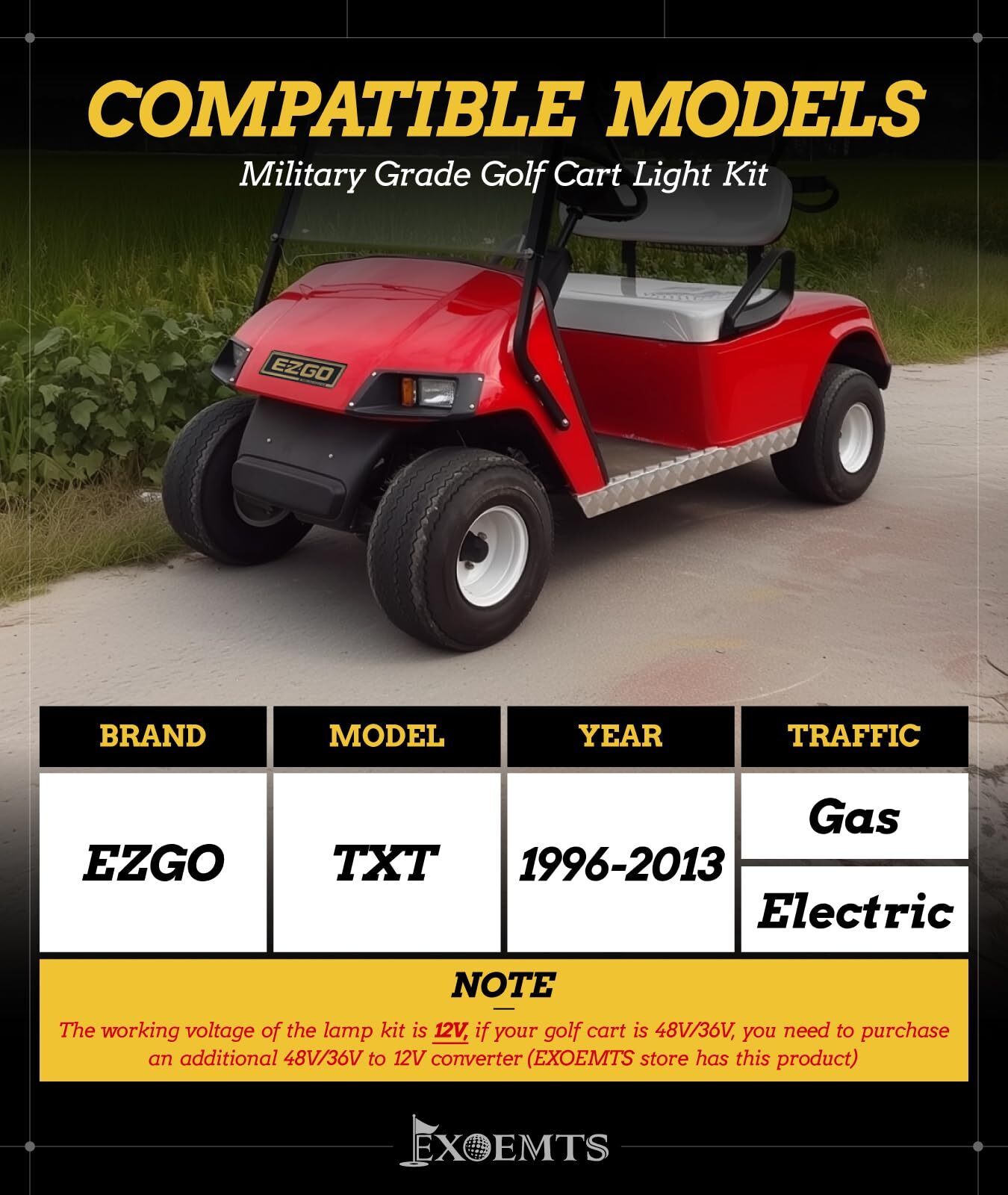 Included Components: 1Pcs*Deluxe Ezgo Txt Light Kit Is Assembly Required: Yes UPC: 797457094040 Specific Uses For Product: Head Lights, Rear Lights, Turning Signal Auto Part Position: Front, Rear Brand: EXOEMTS Lens Material: Glass Material: Metal, Plastic Type: Does not apply Weight: 7.8 Pounds gtin13: 0797457094040 Light Source Type: Led Compatible With Vehicle Type: Ezgo Txt 1996-2013 Gas And Electric Model: Does not apply Package Dimensions LxWxH: 15.83x11.77x7.6 Inches Voltage: 12.0 MPN: Does not apply Color: Black Part Number: 797457094040 Lens Color: Black Item Package Quantity: 1 Model Number: Deluxe Ezgo Txt Light Kit Wattage: 35.0 Automotive Fit Type: Vehicle Specific Fit Model Name: Deluxe Ezgo Txt Light Kit EAN: 0797457094040 ISBN: 0797457094040