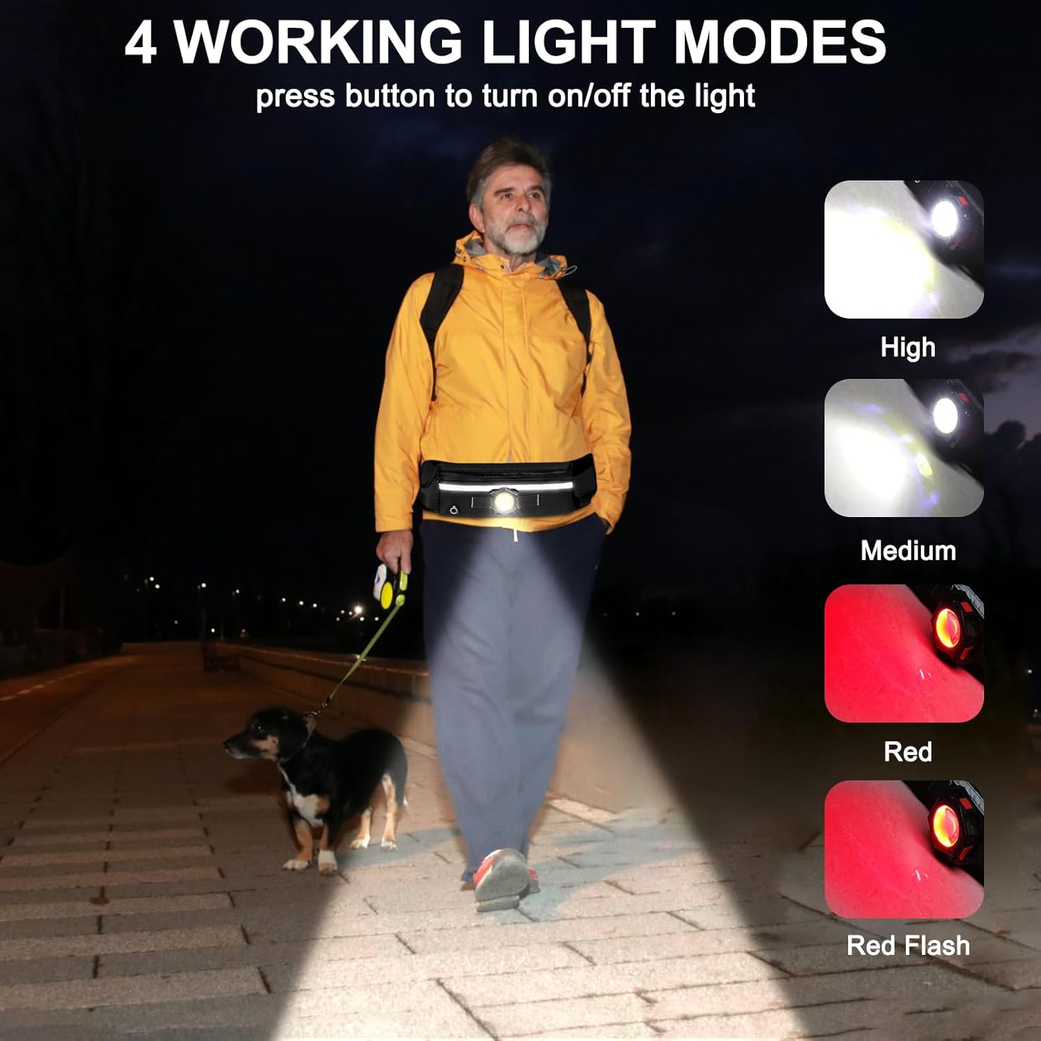 High Lumen: The running light with fanny pack features cob led technology that produces 200 lumen brightness. Anyway, the flood range of cob light can reach 120°, which can help you see surrounding clearly and needn’t to move the body, which is perfect gift for outdoor activities. Four Light Modes: The running light comes with four light modes, including high light, medium light、red light、red flash. Moreover, you can select the desired light mode through their respective on/off button, making it easy to adjust the lighting to suit your environment and needs. Type-C Charging: The waist belt running light supports type-c charging, which can provide up to 3 hours of continuous use on a full charge, making it perfect for running、hiking、walking. Large Capacity: The running fanny pack with water bottle holder is 15.15(L)*3.77(W), which has large capacity pockets and a water bottle holder. You can carry the most needed goods such as key and mobile phone to releasing the hands. Flexible & Detachable: This fanny pack with running light comes with an adjustable belt so it fits all sizes, which is very soft and breathable. Moreover, the cob light on the fanny pack is also readily removable, so you can clean the sweat and stains on the waist bag at any time. Product Description Running Light with 200 Lumen COB Light, Running Waist Belt Do you often feel cumbersome when running with items like cell phones and water bottles, but they can't be left out. At this time, it is necessary to have a product that can meet the needs of lighting and also has a large capacity function. Siuyiu running light with pack, it comes with a 200 lumen rechargeable cob light that offers four modes of lights to meet your different lighting needs. Meanwhile, it is equipped a high-capacity running waist belt with water bottle holder that frees up your hands, it is absolutely perfect for running, dog walking, hiking and camping! 200 Lumen Cob Light The running pack is equipped with a 200 lumen super bright cob light bead, which can easily light up the entire running track. Running Belt for Phone This waist light includes a headphone port for music during activities like running, walking your dog, or hiking, enhancing your outdoor enjoyment. Main Pocket This running light includes a spacious main pocket and two smaller ones for your cell phone, rechargeable battery, cards, and essentials. Adjustable Waistband Our running waist light includes an adjustable belt up to 15.5 inches in length, ensuring a perfect fit for everyone, regardless of size or gender! Other products of Siuyiu Store Customer Reviews 4.1 out of 5 stars 188 4.5 out of 5 stars 63 3.9 out of 5 stars 48 4.6 out of 5 stars 17 4.0 out of 5 stars 48 Lumens 3000 3000 3800 2800 3200 With Cob Light ✘ ✘ ✔ ✘ ✘ Type-C Charging ✔ ✔ ✔ ✔ ✔ Power Bank ✔ ✔ ✘ ✔ ✔ Low Beam/High Beam High Beam High Beam Low Beam High Beam Low Beam Irradiation Distance 3280FT 4000FT 3280FT 3280FT 3280FT Light Source Type LED LED LED LED LED Run Time 14H 14H 14H 14H 14H Size(IN) 7.08"D x 1.85"W x 1.34"H 2"D x 2"W x 7"H 7"D x 2"W x 1"H 7.4 x 2 x 1.4 in 6.42"D x 1.77"W x 1.3"H Batteries included ✔ ✔ ✔ ✔ ✔ Water Resistance IPX45 IPX5 IPX4 IPX45 IPX4