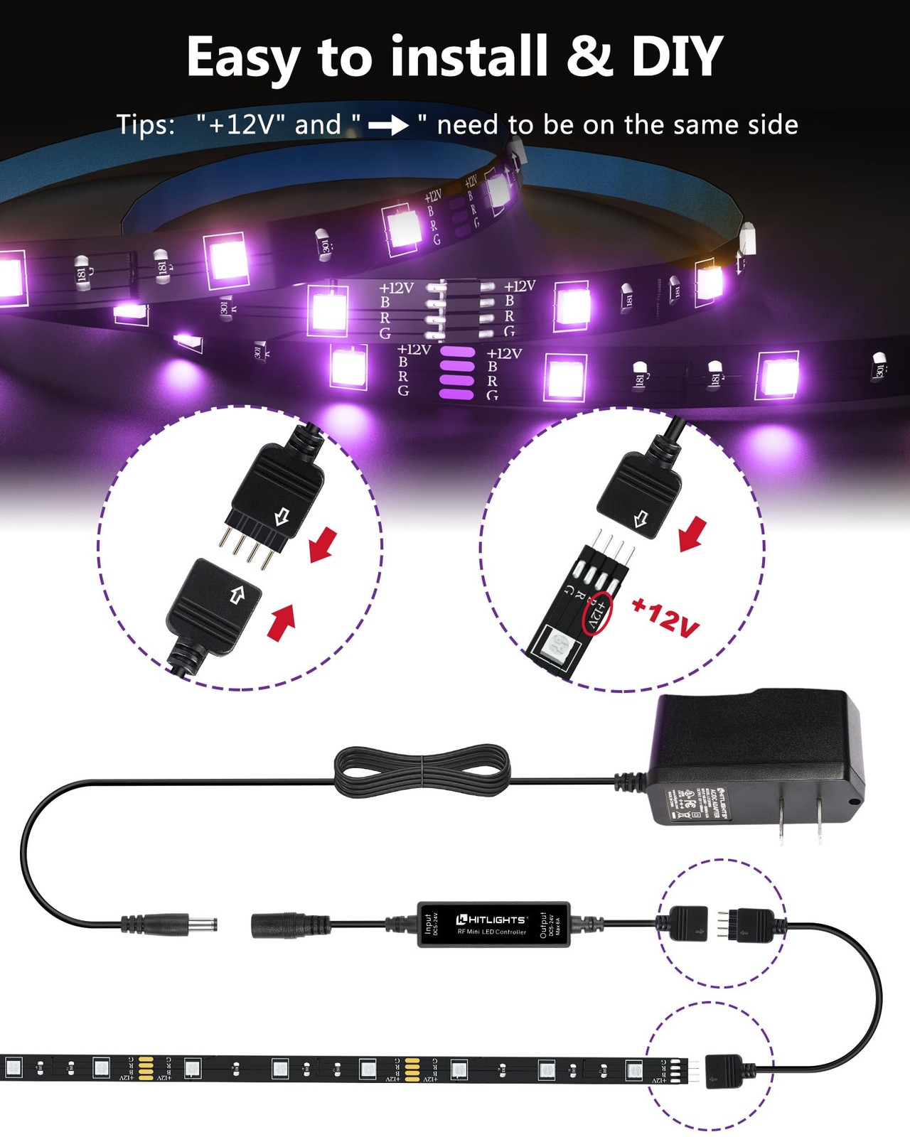 LED Light Strip Flexible Color Changing 5050 LED Accent Kit with RF Remote, Power Supply, and Connectors for TV, Home, DIY Decoration All In One Kit. 3 Pre-cut strip lights including a 21 key RF remote, 12V DC power supply, Total 36Inch (12Inch *3) 5050 LED Strip lights, three plug and play extension wires (12 inch), Six adhesive backed wire clips to keep things neat.It can fully meet your various needs for DIY. The Go-to Ambient Light Kit for the Halloween and Christmas! Decorate your home, your bedroom, stairs, kitchen cabinet, porch, desk, and living room, especially great for holidays like Christmas, Thanksgiving, Halloween, Parties, etc. Color Changing LED Tape Light with 360°RF Controller. The remote comes with 12 colors and 19 modes switch, adjustable brightness and speed. Easily control your LED strip lights within 49-66ft without failure due to obstructions. Upgrade Blue Strong Adhesive. In order to solve the customer's troubles of the light strip adhesive, we have used upgraded adhesive and adhesive backed wire clips for solve this problem. No need to worry about the falling off of the adhesive.The 12V adapter has UL certification, which is safer to use and more durable. 1FT Small RGB LED Strip. PCB board with double layer copper and 36 super bright 5050 leds. The lighting color is pure, more stable and brighter. Suitable for TV backlight, PC gaming light, behind wall decor light, showcase display light, under cabinet light, shelf light, Collection cabinet, fish tank background light, etc.