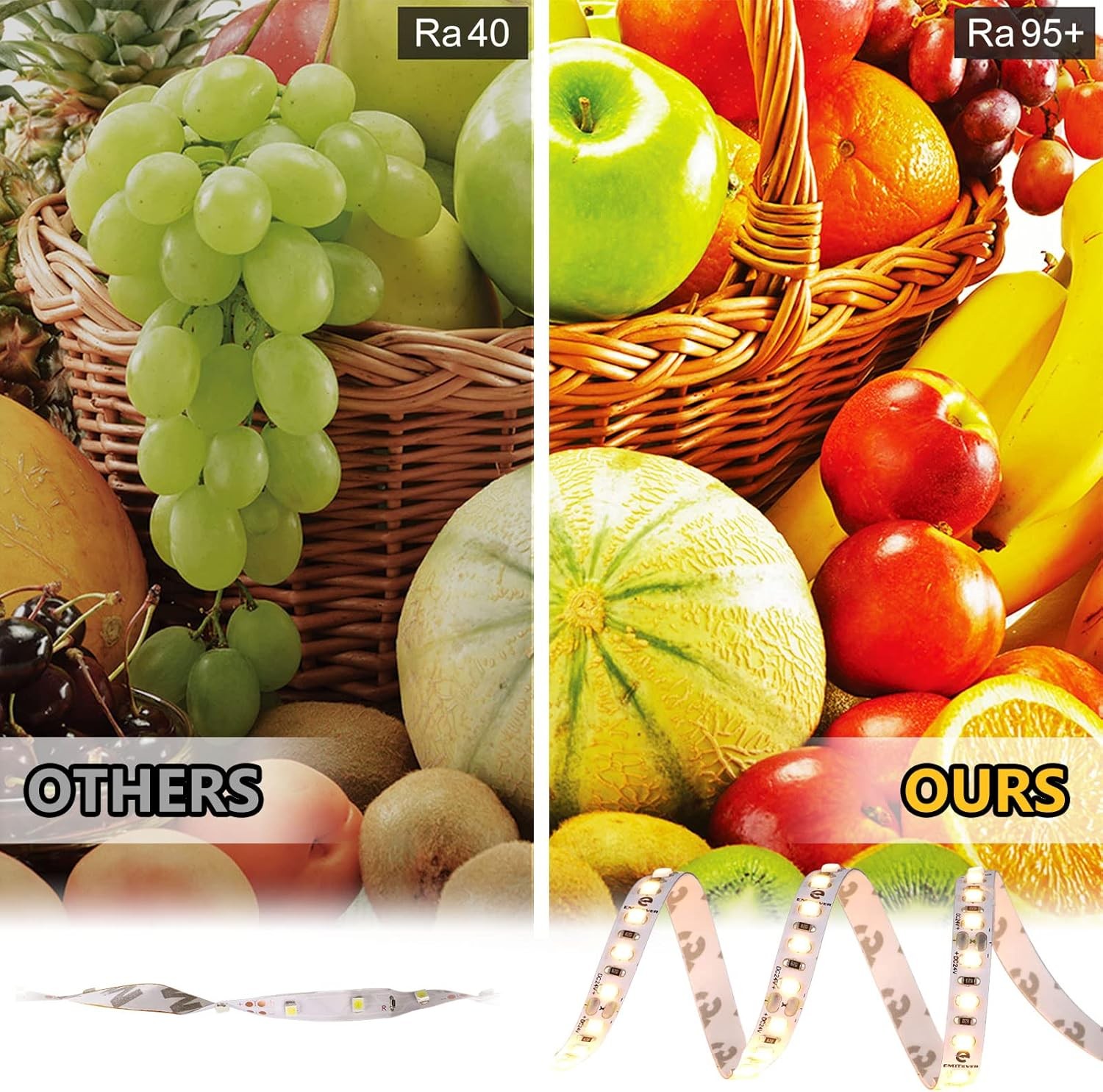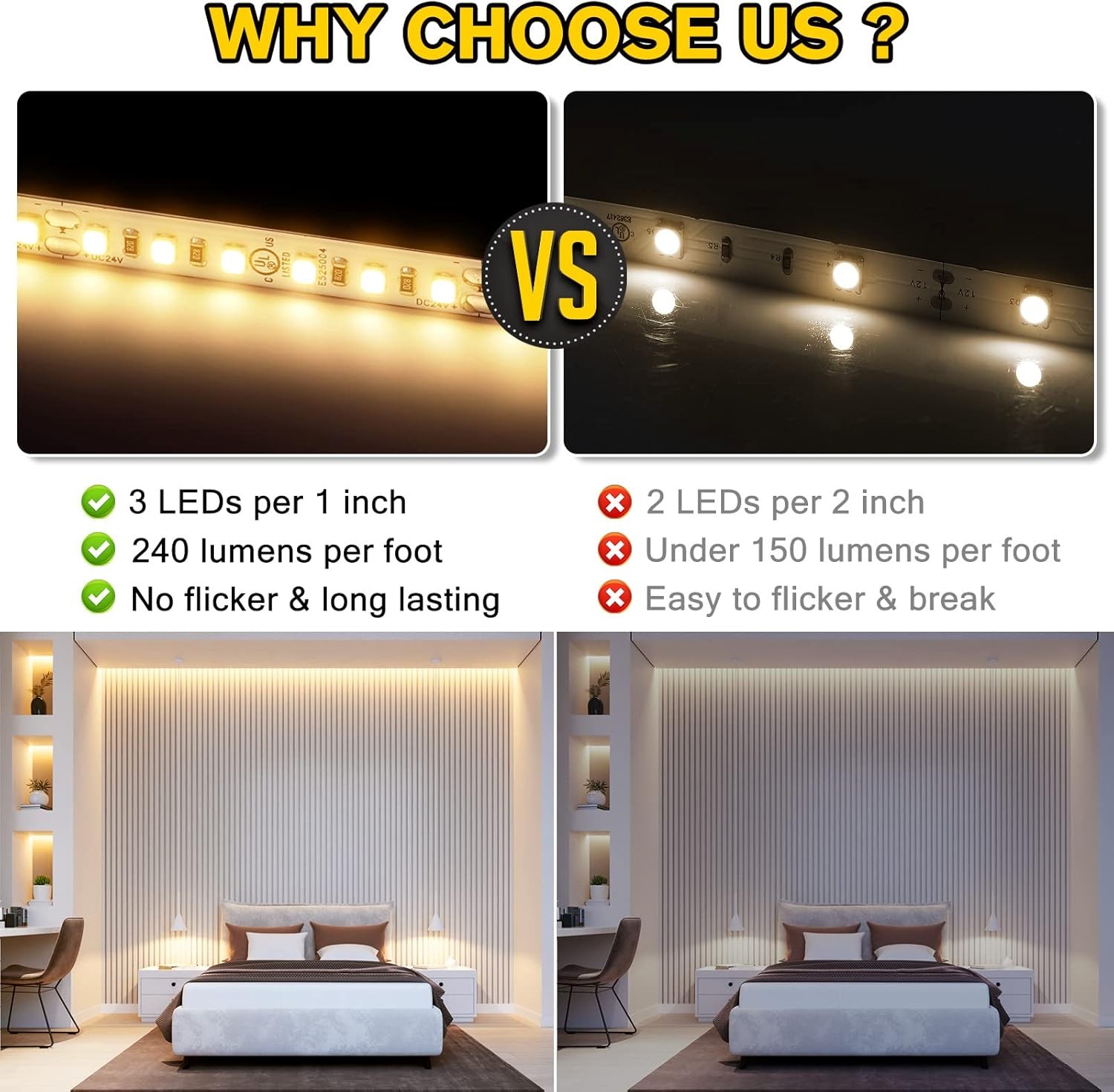 About this item These strips are installed in a wide variety of applications including general accent lighting, under cabinet lighting, above cabinet lighting, toe kick lighting, shelving lighting, back lighting, bathroom and bedroom lighting, ambient lighting, cove lighting, awning and eave lighting, bar and restaurant lighting, pathway lighting, and hotel lighting. The higher the display index, Ra>95+, R9>75+, the better the color rendering of the light source, enhancing the ability to restore the color of objects, reducing the likelihood of damaging eyesight. Benefits: For most applications, 24V is preferred, making it more compatible with dimming systems and remotes such as 0/1-10v, phone app dimming, and RF handheld dimmers. Dimmable (0-100%) with most ELV, TRIAC dimmers. Quality Control, Performance: Double sized PCB width 8mm, SMD2835 LED strip lights in 900 LED lengths; cuttable every 1.97”, 32.8ft (DC 24V) max run without voltage drop. SIMPLE and EASY TO USE: Easy installation featuring 3M 55280 adhesive backing. Low voltage bright LED light strips for commercial and residential use. Packing list: one reel 25ft(7.5m) LED strip lights + two clips + user guide. Dimensions: 7.68 x 6.3 x 0.59 inches; 5.61 ounces.