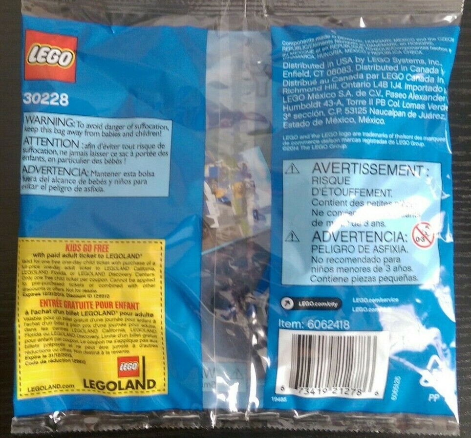 LEGO CITY #30228 Police ATV Number of Pieces: 22 pieces Condition: Brand New, Factory Sealed, Never Opened Manufacturer: LEGO Additional Comments: See photo for details of actual item. Smoke-free, pet free home. Shipping: Domestic shipping in padded mailer LEGOLAND Free Child Ticket Expired in 2015. DO NOT PURCHASE WITH THE EXPECTATION THAT COUPON WILL BE HONORED. THIS LISTING DOES NOT IMPLY THAT IT WILL BE, NOR WILL SELLER BE HELD ACCOUNTABLE WERE COUPON NOT HONORED BY LEGOLAND.