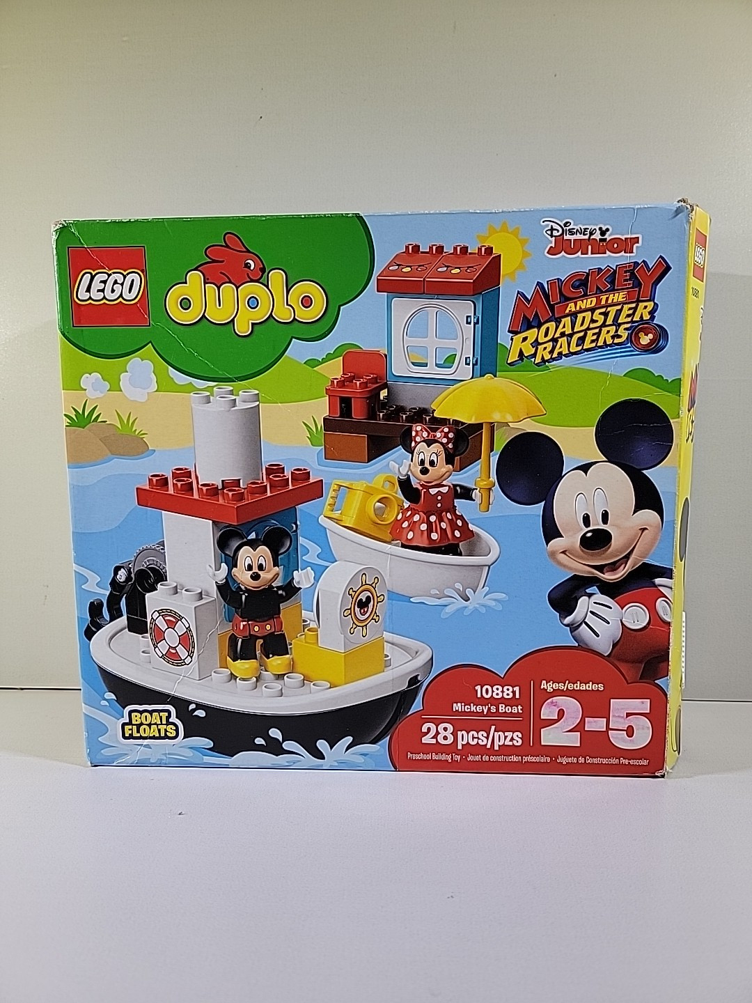 This is a LEGO Duplo set featuring Mickey Mouse and his friends from The Roadster Racers. The set includes 28 pieces and allows you to build Mickey's boat. It comes in its original packaging and is a retired set from 2018. The set number is 10881, and it belongs to the Mickey Mouse theme. The set includes both Mickey and Minnie Mouse characters and is suitable for children aged 2-5 years old. The set is made of plastic and was manufactured in Denmark, Hungary, Mexico, China, and the Czech Republic.