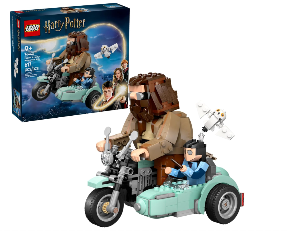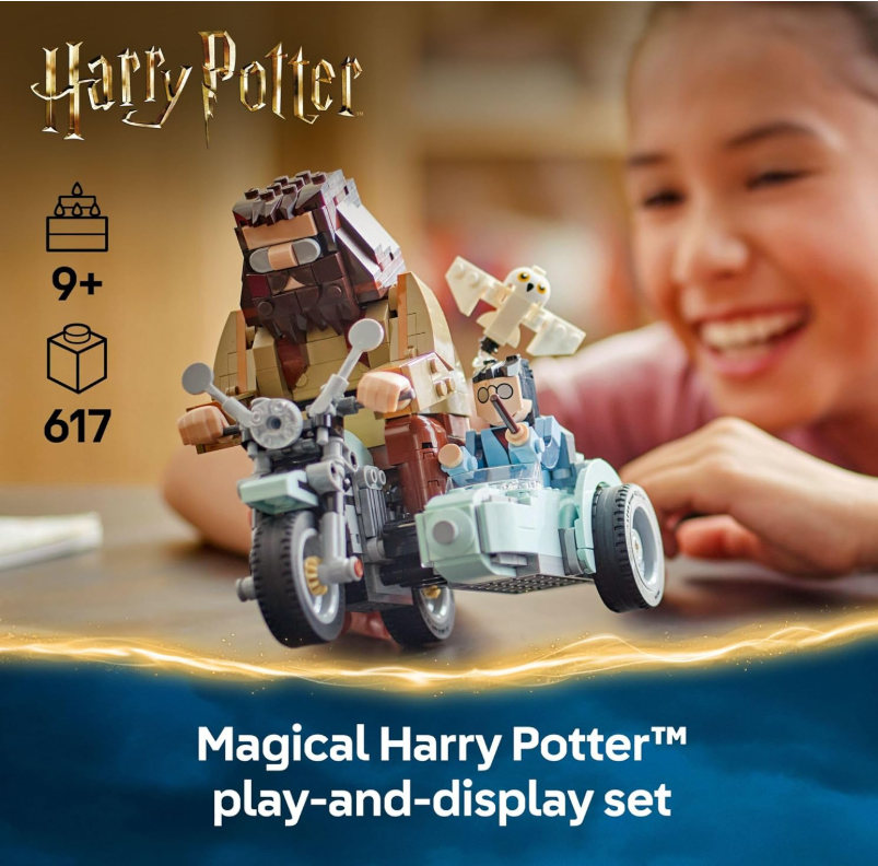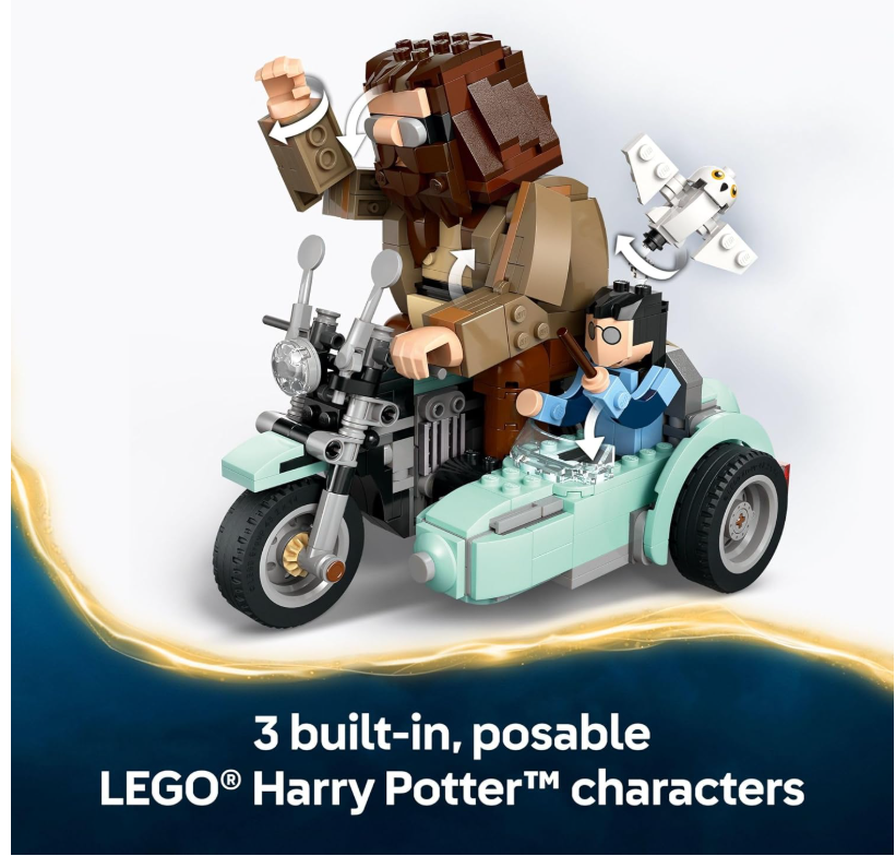 Hold tight and head for The Burrow on Hagrid's flying motorcycle! Play out dramatic Harry Potter and the Deathly Hallows scenes and make your own stories with this detailed model. Drive the bike with the half-giant Hagrid and Harry Potter in the sidecar, plus Hedwig the owl on the back. Or simply display your magical creation as part of your brick-built collection of LEGO Harry Potter sets!