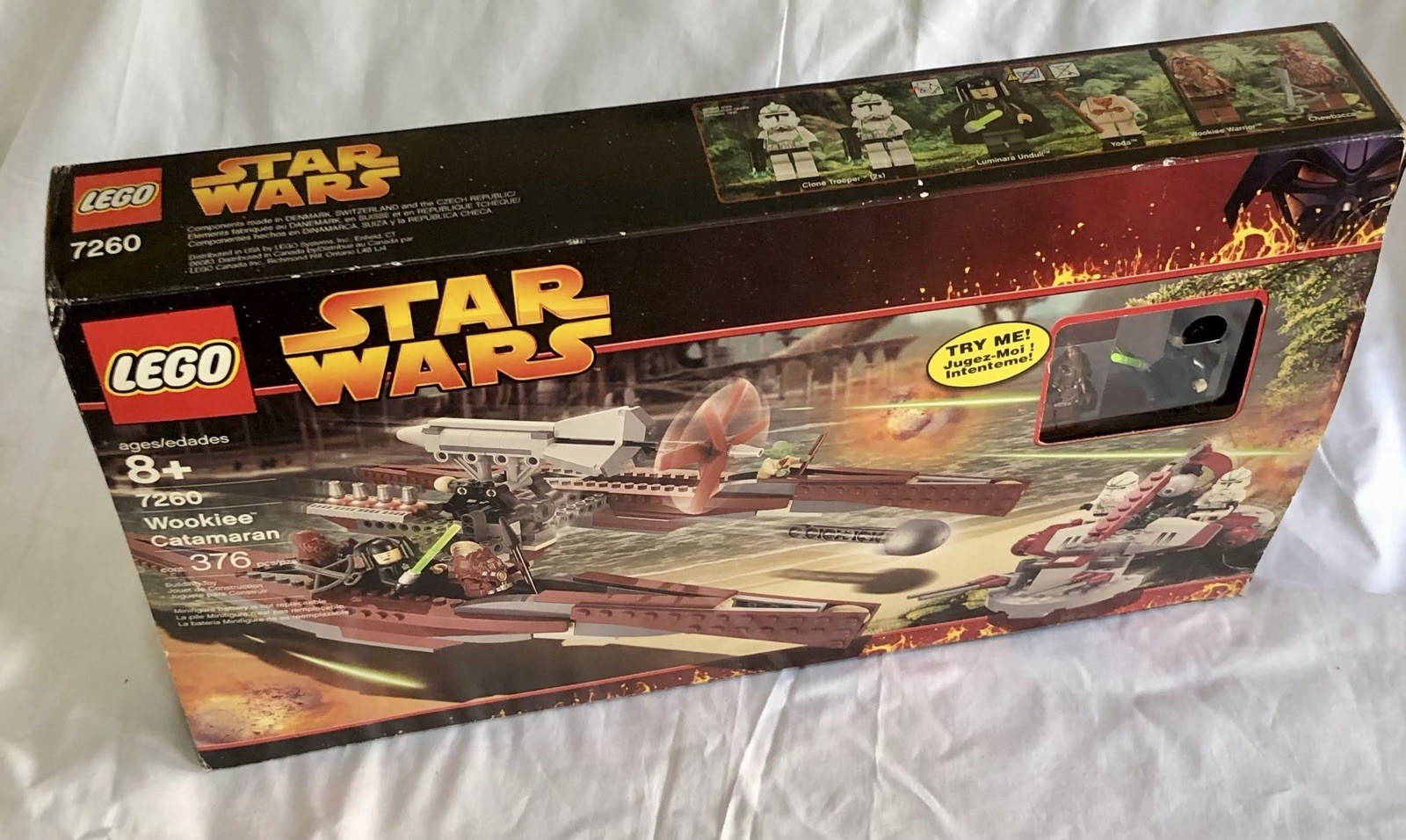 The LEGO Star Wars 7260 Wookie Catamaran set is a rare find, as it is retired and includes all the mini figures. With 376 pieces, this complete set allows for hours of building fun for fans of Star Wars and LEGO. The set, released in 2005, features the iconic Wookiee Catamaran from the Star Wars universe, measuring 18.9 inches in length, 2.8 inches in height, and 11.3 inches in width. This collectible item comes in its original box packaging, and instructions. The set is complete and in excellent condition. All mini figures are included and in very good condition. Luminara’s Light up saber is working